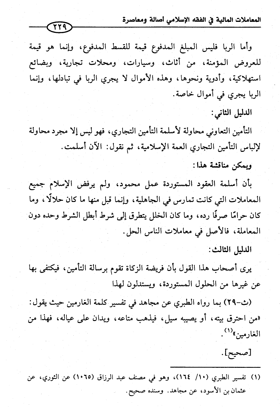 (ث-٢٩) بما رواه الطبري عن مجاهد في تفسير كلمة الغارمين حيث يقول: "من احترق بيته، أو يصيبه سيل، فيذهب متاعه، ويدان على عياله، فهذا من الغارمين" (¬١).