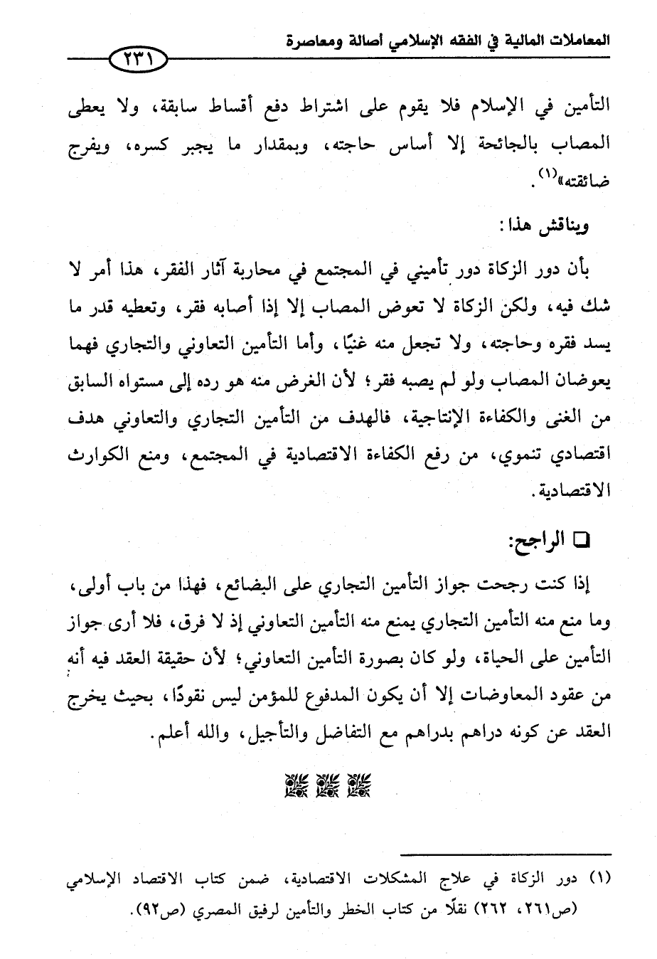 (¬١) دور الزكاة في علاج المشكلات الاقتصادية، ضمن كتاب الاقتصاد الإِسلامي (ص ٢٦١، ٢٦٢) نقلًا من كتاب الخطر والتأمين لرفيق المصري (ص ٩٢).