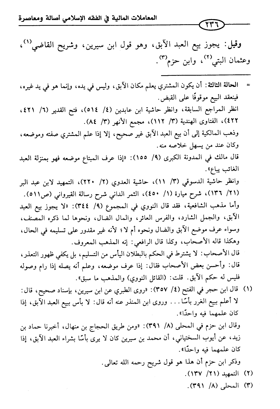 (¬١) قال ابن حجر في الفتح (٤/ ٣٥٧): "روى الطبري عن ابن سيرين، بإسناد صحيح، قال: لا أعلم ببيع الغرر بأسًا ... وروى ابن المنذر عنه أنه قال: لا بأس ببيع العبد الآبق، إذا كان علمهما فيه واحدًا".