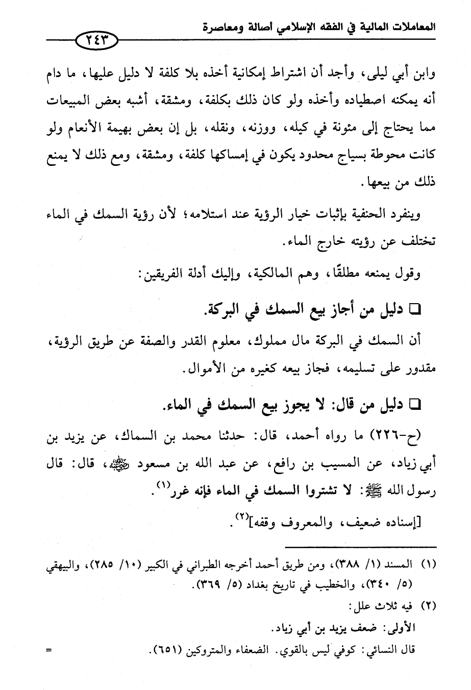 (ح-٢٢٦) ما رواه أحمد، قال: حدثنا محمد بن السماك، عن يزيد بن أبي زياد، عن المسيب بن رافع، عن عبد الله بن مسعود - رضي الله عنه -، قال: قال رسول الله - صلى الله عليه وسلم -: لا تشتروا السمك في الماء فإنه غرر (¬١).