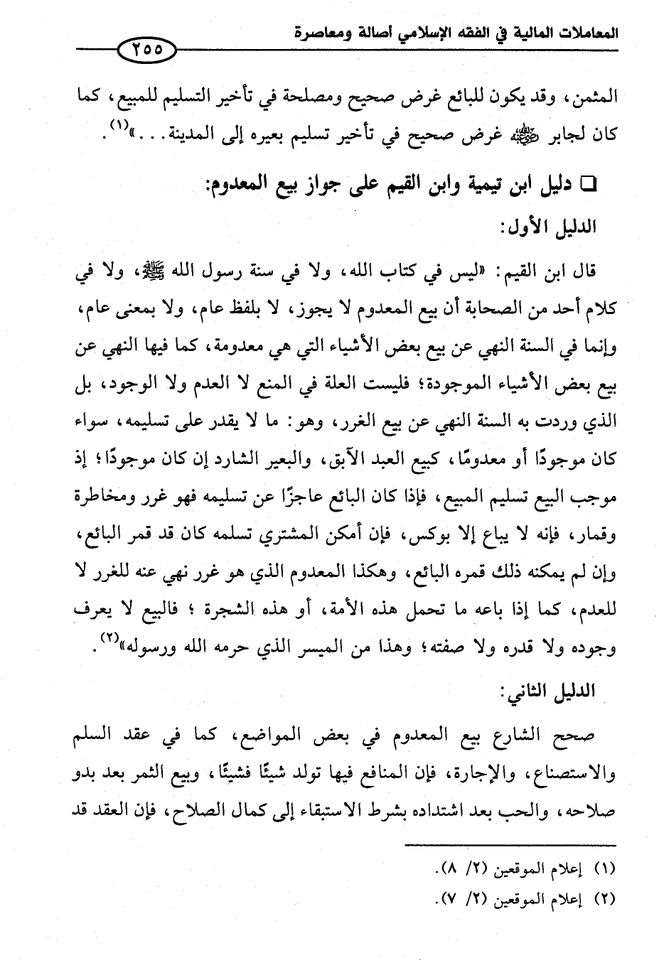 قال ابن القيم: "ليس في كتاب الله، ولا في سنة رسول الله - صلى الله عليه وسلم -، ولا في كلام أحد من الصحابة أن بيع المعدوم لا يجوز، لا بلفظ عام، ولا بمعنى عام، وإنما في السنة النهي عن بيع بعض الأشياء التي هي معدومة، كما فيها النهي عن بيع بعض الأشياء الموجودة , فليست العلة في المنع لا العدم ولا الوجود، بل الذي وردت به السنة النهي عن بيع الغرر، وهو: ما لا يقدر على تسليمه، سواء كان موجودًا أو معدومًا، كبيع العبد الآبق، والبعير الشارد إن كان موجودًا , إذ موجب البيع تسليم المبيع، فإذا كان البائع عاجزًا عن تسليمه فهو غرر ومخاطرة وقمار، فإنه لا يباع إلا بوكس، فإن أمكن المشتري تسلمه كان قد قمر البائع، وإن لم يمكنة ذلك قمره البائع، وهكذا المعدوم الذي هو غرر نهي عنه للغرر لا للعدم، كما إذا باعه ما تحمل هذه الأمة، أو هذه الشجرة , فالبيع لا يعرف وجوده ولا قدره ولا صفته , وهذا من الميسر الذي حرمه الله ورسوله" (¬٢).