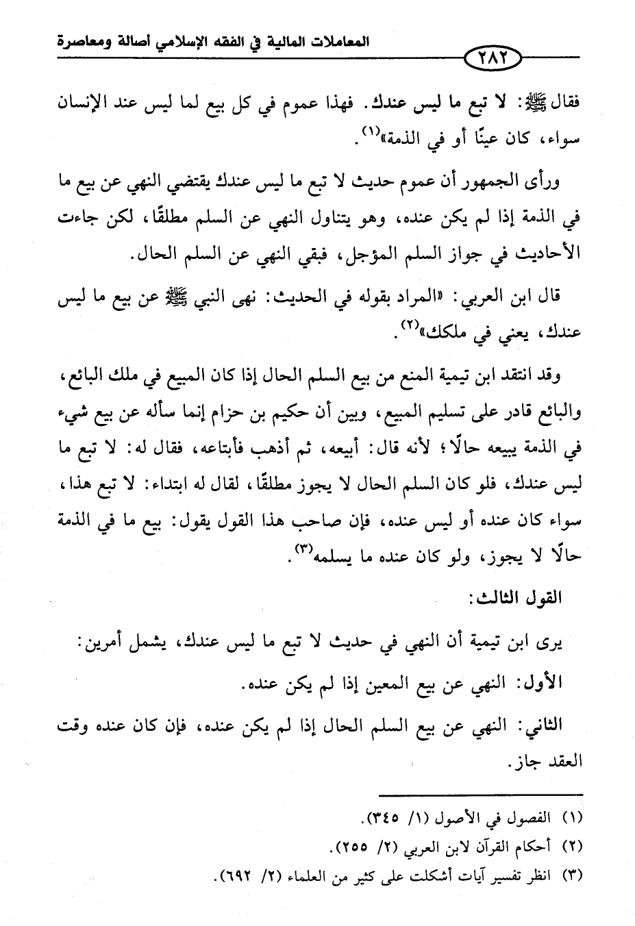 وقد انتقد ابن تيمية المنع من بيع السلم الحال إذا كان المبيع في ملك البائع، والبائع قادر على تسليم المبيع، وبين أن حكيم بن حزام إنما سأله عن بيع شيء في الذمة يبيعه حالاً؛ لأنه قال: أبيعه، ثم أذهب فأبتاعه، فقال له: لا تبع ما ليس عندك، فلو كان السلم الحال لا يجوز مطلقًا، لقال له ابتداء: لا تبع هذا، سواء كان عنده أو ليس عنده، فإن صاحب هذا القول يقول: بيع ما في الذمة حالاً لا يجوز، ولو كان عنده ما يسلمه (¬٣).