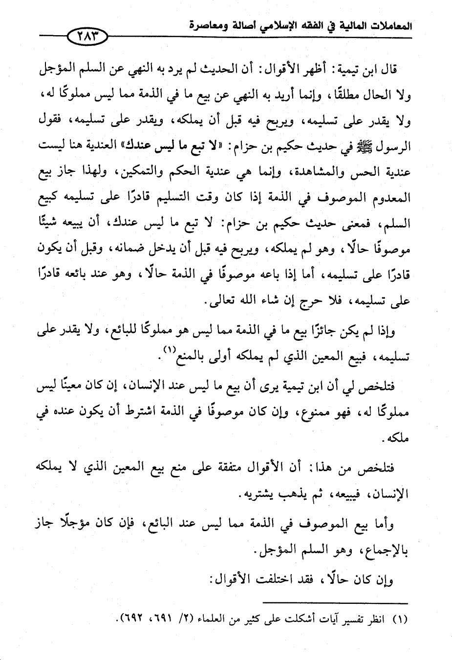 قال ابن تيمية: أظهر الأقوال: أن الحديث لم يرد به النهي عن السلم المؤجل ولا الحال مطلقًا، وإنما أريد به النهي عن بيع ما في الذمة مما ليس مملوكًا له، ولا يقدر على تسليمه، ويربح فيه قبل أن يملكه، ويقدر على تسليمه، فقول الرسول - صلى الله عليه وسلم - في حديث حكيم بن حزام: "لا تبع ما ليس عندك" العندية هنا ليست عندية الحس والمشاهدة، وإنما هي عندية الحكم والتمكين، ولهذا جاز بيع المعدوم الموصوف في الذمة إذا كان وقت التسليم قادرًا على تسليمه كبيع السلم، فمعنى حديث حكيم بن حزام: لا تبع ما ليس عندك، أن يبيعه شيئاً موصوفا حالاً، وهو لم يملكه، ويربح فيه قبل أن يدخل ضمانه، وقبل أن يكون قادرًا على تسليمه، أما إذا باعه موصوفًا في الذمة حالًا، وهو عند بائعه قادرًا على تسليمه، فلا حرج إن شاء الله تعالى.