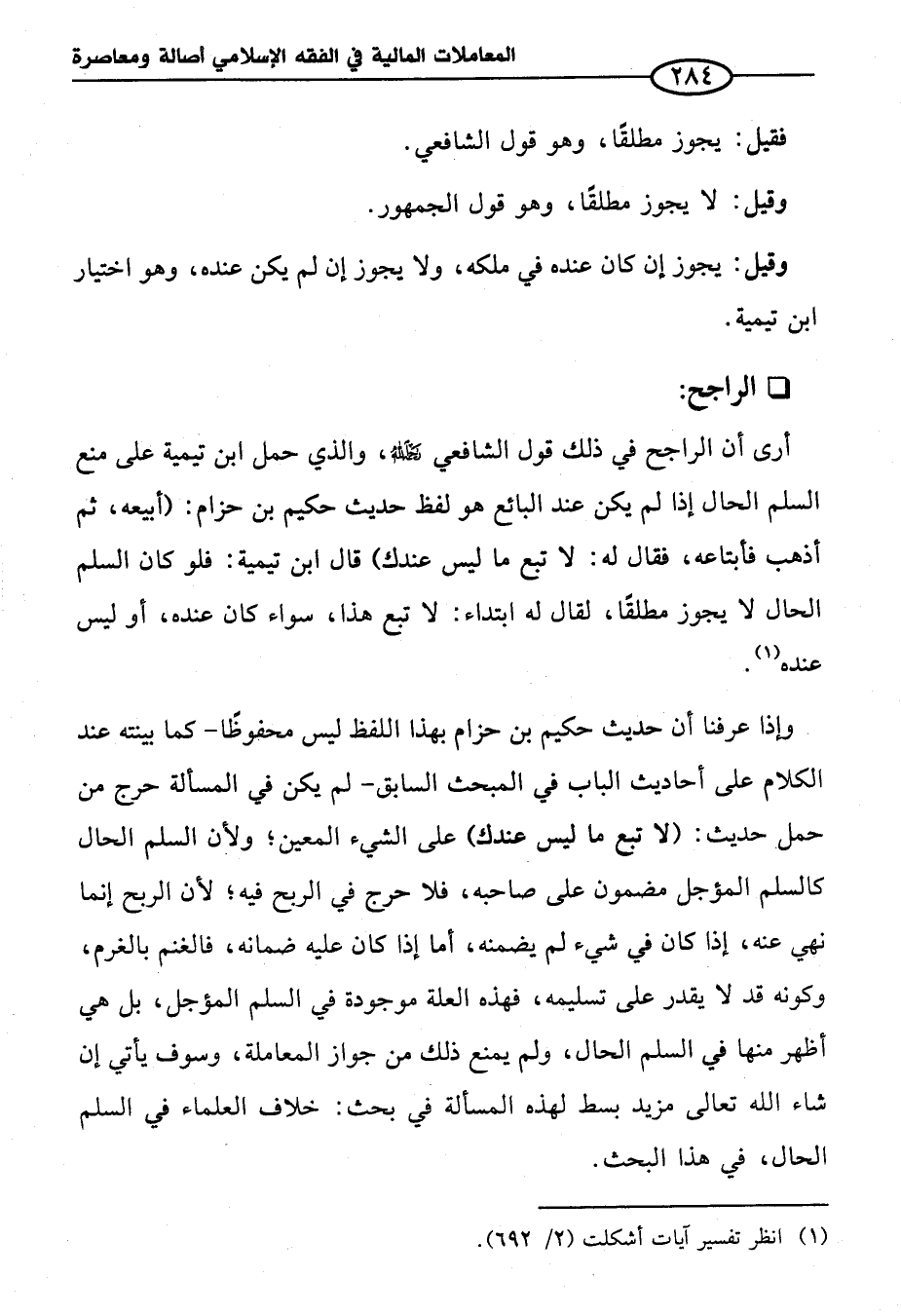 وإذا عرفنا أن حديث حكيم بن حزام بهذا اللفظ ليس محفوظًا -كما بينته عند الكلام على أحاديث الباب في المبحث السابق- لم يكن في المسألة حرج من حمل حديث: (لا تبع ما ليس عندك) على الشيء المعين , ولأن السلم الحال كالسلم المؤجل مضمون على صاحبه، فلا حرج في الربح فيه؛ لأن الربح إنما نهي عنه، إذا كان في شيء لم يضمنه، أما إذا كان عليه ضمانه، فالغنم بالغرم، وكونه قد لا يقدر على تسليمه، فهذه العلة موجودة في السلم المؤجل، بل هي أظهر منها في السلم الحال، ولم يمنع ذلك من جواز المعاملة، وسوف يأتي إن شاء الله تعالى مزيد بسط لهذه المسألة في بحث: خلاف العلماء في السلم الحال، في هذا البحث.