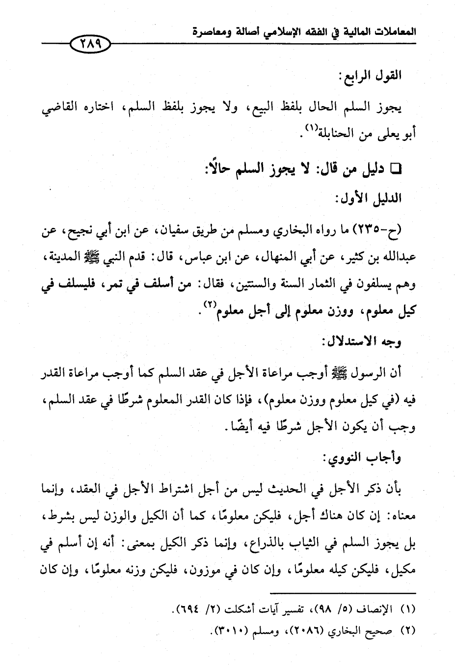 أن الرسول - صلى الله عليه وسلم - أوجب مراعاة الأجل في عقد السلم كما أوجب مراعاة القدر فيه (في كيل معلوم ووزن معلوم)، فإذا كان القدر المعلوم شرطًا في عقد السلم، وجب أن يكون الأجل شرطاً فيه أيضًا.