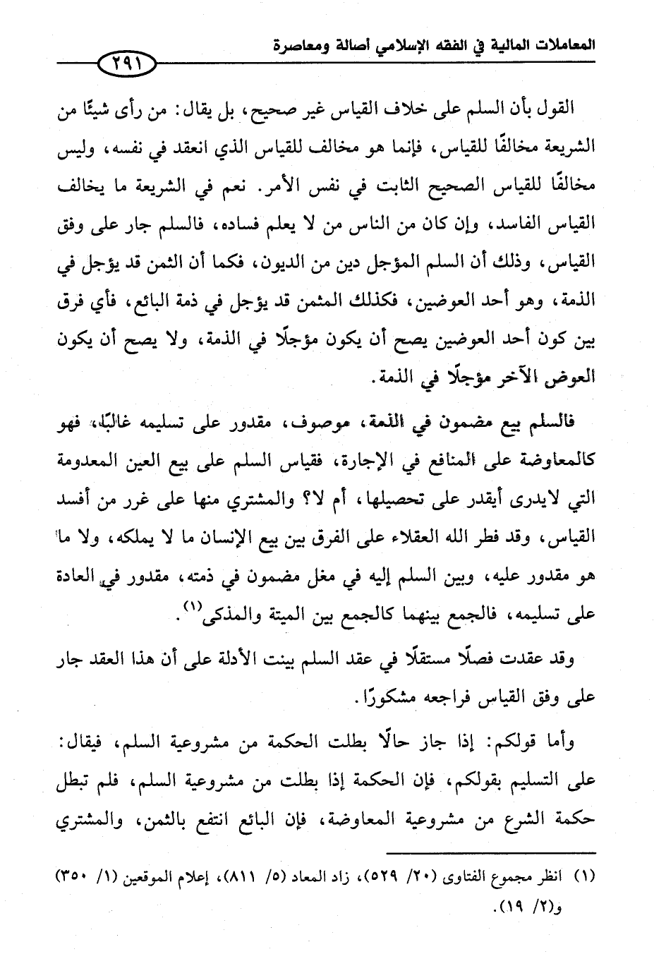 القول بأن السلم على خلاف القياس غير صحيح، بل يقال: من رأى شيئًا من الشريعة مخالفًا للقياس، فإنما هو مخالف للقياس الذي انعقد في نفسه، وليس مخالفًا للقياس الصحيح الثابت في نفس الأمر. نعم في الشريعة ما يخالف القياس الفاسد، وإن كان من الناس من لا يعلم فساده، فالسلم جار على وفق القياس، وذلك أن السلم المؤجل دين من الديون، فكما أن الثمن قد يؤجل في الذمة، وهو أحد العوضين، فكذلك المثمن قد يؤجل في ذمة البائع، فأي فرق بين كون أحد العوضين يصح أن يكون مؤجلًا في الذمة، ولا يصح أن يكون العوض الآخر موجلًا في الذمة.