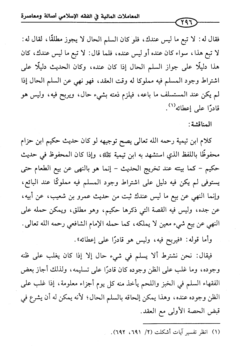 كلام ابن تيمية رحمه الله تعالى يصح توجيهه لو كان حديث حكيم ابن حزام محفوظا باللفظ الذي استشهد به ابن تيمية رحمه الله، وإذا كان المحفوظ في حديث حكيم -كما بينته عند تخريج الحديث- إنما هو بالنهى عن بيع الطعام حتى يستوفى لم يكن فيه دليل على اشتراط وجود المسلم فيه مملوكًا عند البائع، وإنما النهي عن بيع ما ليس عندك ثبت من حديث عمرو بن شعيب، عن أبيه، عن جده، وليس فيه القصة التي ذكرها حكيم، وهو مطلق، ويمكن حمله على النهي عن بيع شيء معين لا يملكه، كما حمله الإِمام الشافعي رحمه الله تعالى.