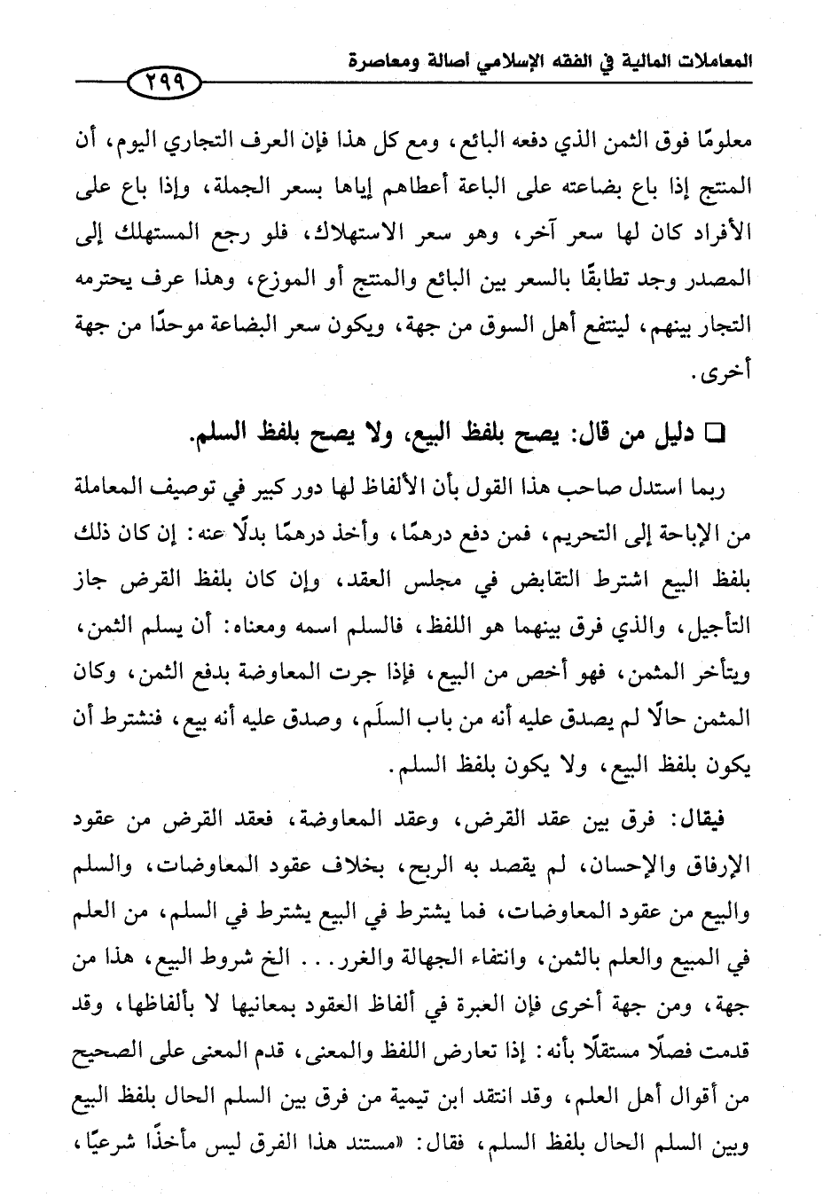 فيقال: فرق بين عقد القرض، وعقد المعاوضة، فعقد القرض من عقود الإرفاق والإحسان , لم يقصد به الربح، بخلاف عقود المعاوضات، والسلم والبيع من عقود المعاوضات، فما يشترط في البيع يشترط في السلم، من العلم في المبيع والعلم بالثمن، وانتفاء الجهالة والغرر ... الخ شروط البيع، هذا من جهة، ومن جهة أخرى فإن العبرة في ألفاظ العقود بمعانيها لا بألفاظها، وقد قدمت فصلًا مستقلًا بأنه: إذا تعارض اللفظ والمعنى، قدم المعنى على الصحيح من أقوال أهل العلم، وقد انتقد ابن تيمية من فرق بين السلم الحال بلفظ البيع وبين السلم الحال بلفظ السلم، فقال: "مستند هذا الفرق ليس مأخذًا شرعيًا،