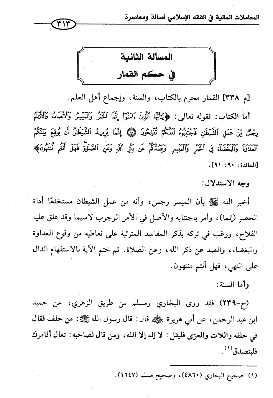 أخبر الله سبحانه وتعالى بأن الميسر رجس، وأنه من عمل الشيطان مستخدمًا أداة الحصر (إنما)، وأمر باجتنابه والأصل في الأمر الوجوب لا سيما وقد علق عليه الفلاح، ورغب في تركه بذكر المفاسد المترتبة على تعاطيه من وقوع العداوة والبغضاء، والصد عن ذكر الله، وعن الصلاة. ثم ختم الآية بالاستفهام الدال على النهي، فهل أنتم منتهون.