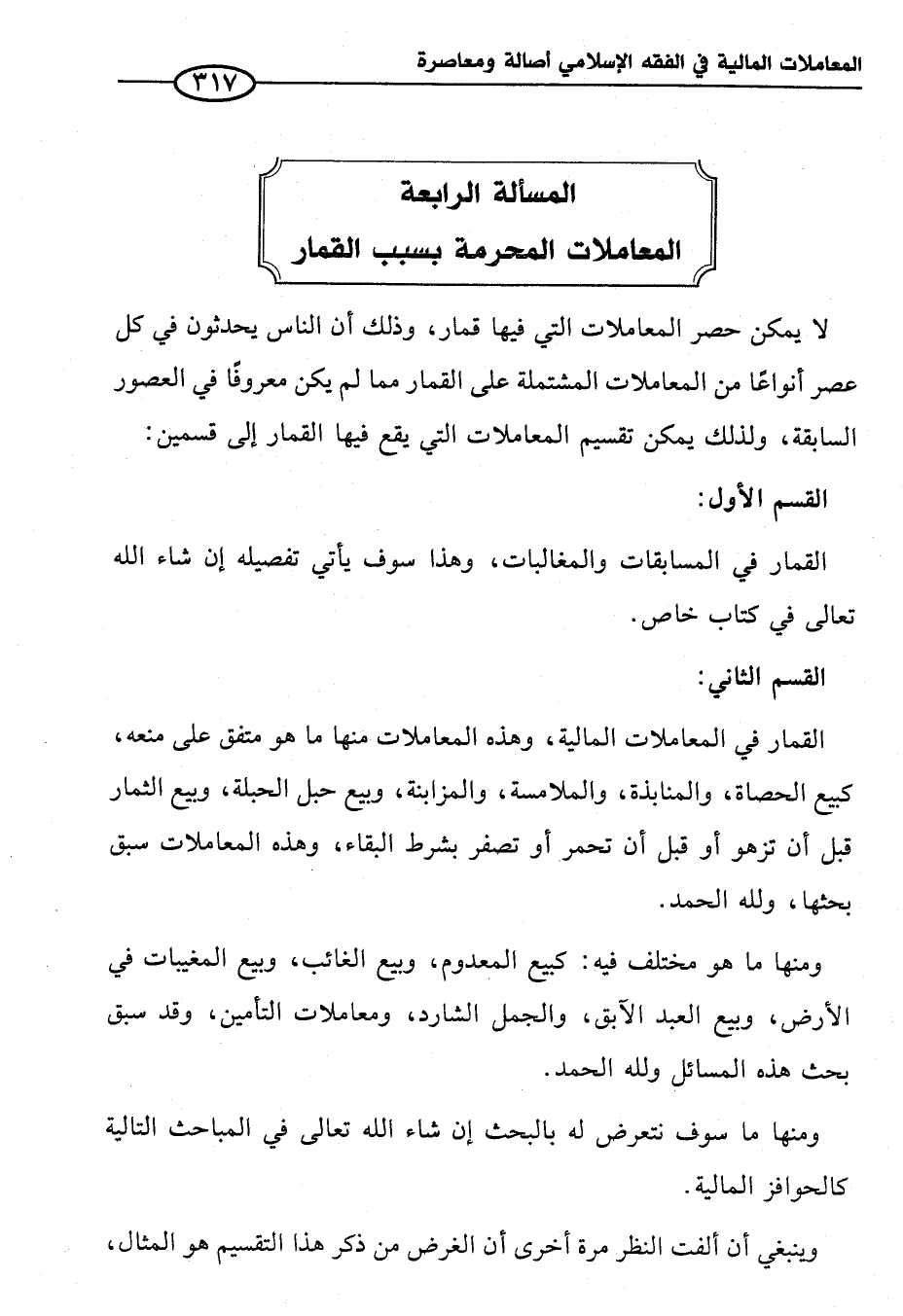 المسألة الرابعة المعاملات المحرمة بسبب القمار