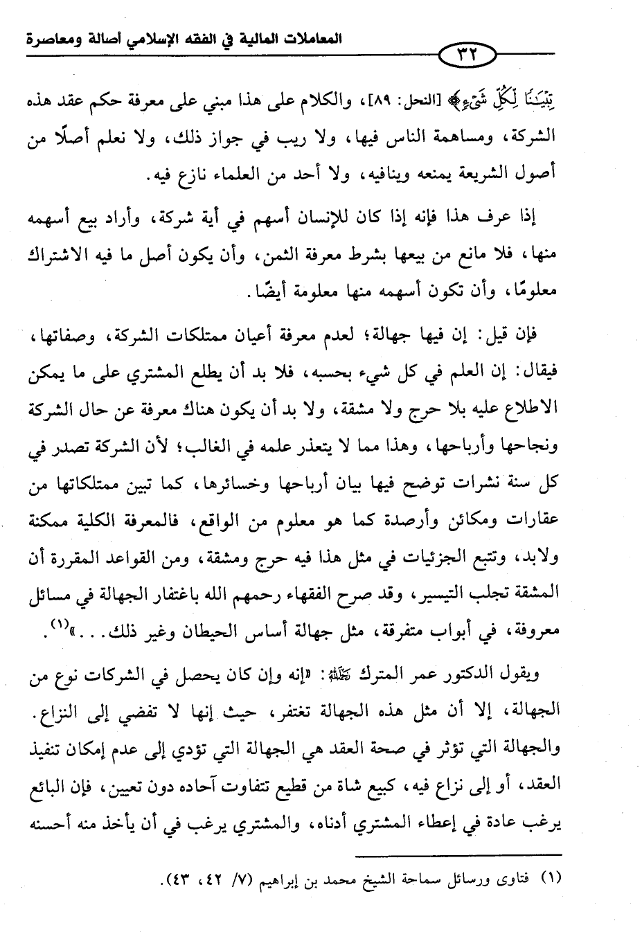 فإن قيل: إن فيها جهالة؛ لعدم معرفة أعيان ممتلكات الشركة، وصفاتها، فيقال: إن العلم في كل شيء بحسبه، فلا بد أن يطلع المشتري على ما يمكن الاطلاع عليه بلا حرج ولا مشقة، ولا بد أن يكون هناك معرفة عن حال الشركة ونجاحها وأرباحها، وهذا مما لا يتعذر علمه في الغالب؛ لأن الشركة تصدر في كل سنة نشرات توضح فيها بيان أرباحها وخسائرها، كما تبين ممتلكاتها من عقارات ومكائن وأرصدة كما هو معلوم من الواقع، فالمعرفة الكلية ممكنة ولابد، وتتبع الجزئيات في مثل هذا فيه حرج ومشقة، ومن القواعد المقررة أن المشقة تجلب التيسير، وقد صرح الفقهاء رحمهم الله باغتفار الجهالة في مسائل معروفة، في أبواب متفرقة، مثل جهالة أساس الحيطان وغير ذلك ... " (¬١).