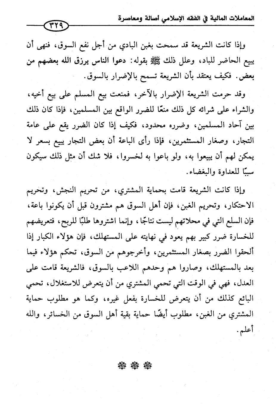 وإذا كانت الشريعة قد سمحت بغبن البادي من أجل نفع السوق، فنهى أن يبيع الحاضر للباد، وعلل ذلك - صلى الله عليه وسلم - بقوله: دعوا الناس يرزق الله بعضهم من بعض. فكيف يعتقد بأن الشريعة تسمح بالإضرار بالسوق.