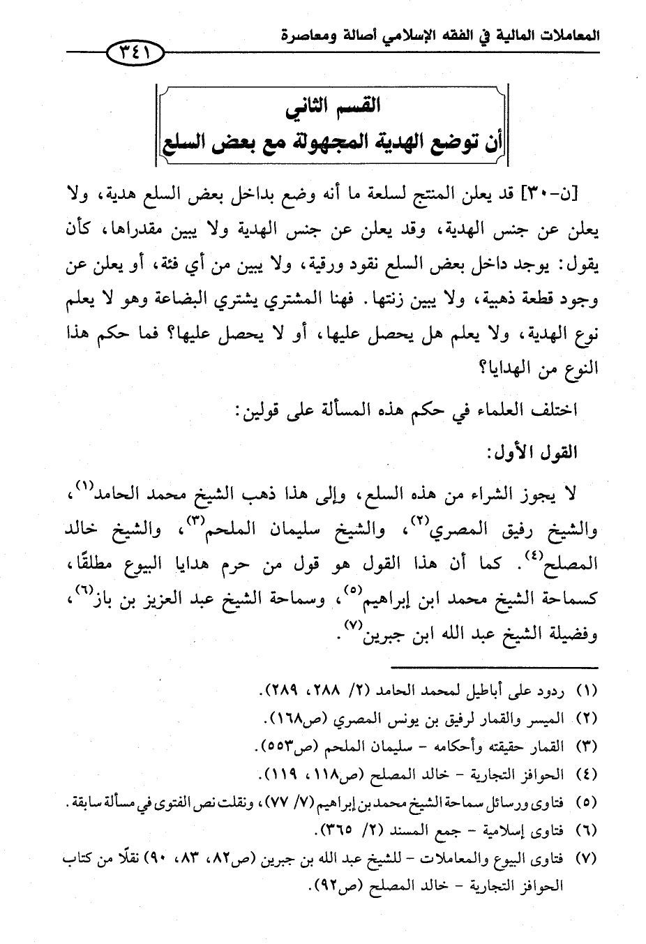 (¬٧) فتاوى البيوع والمعاملات - للشيخ عبد الله بن جبرين (ص ٨٢، ٨٣، ٩٠) نقلًا من كتاب الحوافز التجارية - خالد المصلح (ص ٩٢).