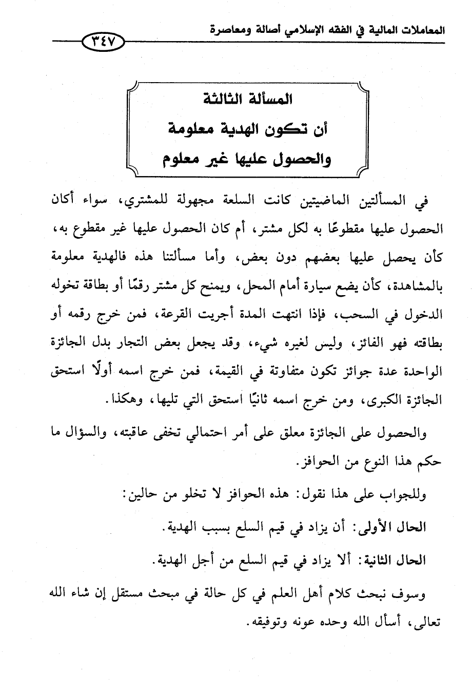 في المسألتين الماضيتين كانت السلعة مجهولة للمشتري، سواء أكان الحصول عليها مقطوعًا به لكل مشتر، أم كان الحصول عليها غير مقطوع به، كأن يحصل عليها بعضهم دون بعض، وأما مسألتنا هذه فالهدية معلومة بالمشاهدة، كأن يضع سيارة أمام المحل، ويمنح كل مشتر رقمًا أو بطاقة تخوله الدخول في السحب، فإذا انتهت المدة أجريت القرعة، فمن خرج رقمه أو بطاقته فهو الفائز، وليس لغيره شيء، وقد يجعل بعض التجار بدل الجائزة الواحدة عدة جوائز تكون متفاوتة في القيمة، فمن خرج اسمه أولًا استحق الجائزة الكبرى، ومن خرج اسمه ثانيًا استحق التي تليها، وهكذا.