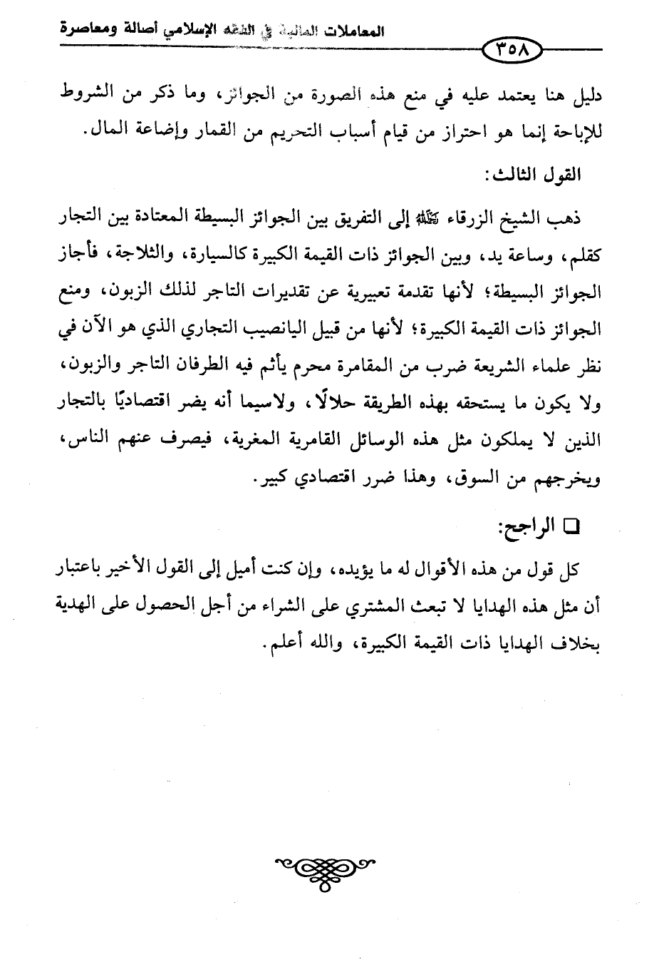 ذهب الشيخ الزرقاء رحمه الله إلى التفريق بين الجوائز البسيطة المعتادة بين التجار كقلم، وساعة يد، وبين الجوائز ذات القيمة الكبيرة كالسيارة، والثلاجة، فأجاز الجوائز البسيطة؛ لأنها تقدمة تعبيرية عن تقديرات التاجر لذلك الزبون، ومنع الجوائز ذات القيمة الكبيرة؛ لأنها من قبيل اليانصيب التجاري الذي هو الآن في نظر علماء الشريعة ضرب من المقامرة محرم يأثم فيه الطرفان التاجر والزبون، ولا يكون ما يستحقه بهذه الطريقة حلالًا, ولا سيما أنه يضر اقتصاديًا بالتجار الذين لا يملكون مثل هذه الوسائل القامرية المغرية، فيصرف عنهم الناس، ويخرجهم من السوق، وهذا ضرر اقتصادي كبير.