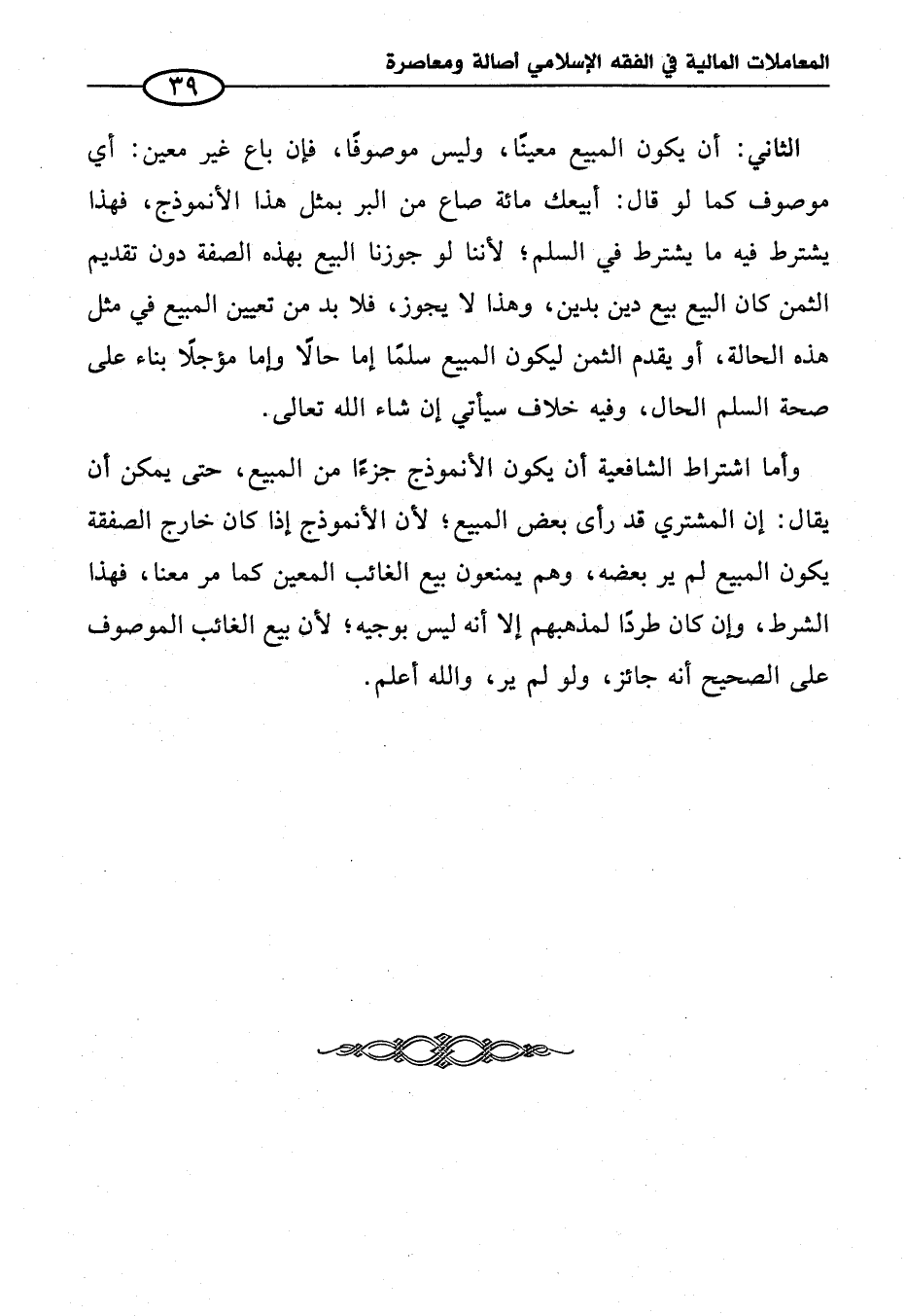 الثاني: أن يكون المبيع معينًا، وليس موصوفًا، فإن باع غير معين: أي موصوف كما لو قال: أبيعك مائة صاع من البر بمثل هذا الأنموذج، فهذا يشترط فيه ما يشترط في السلم؛ لأننا لو جوزنا البيع بهذه الصفة دون تقديم الثمن كان البيع بيع دين بدين، وهذا لا يجوز، فلا بد من تعيين المبيع في مثل هذه الحالة، أو يقدم الثمن ليكون المبيع سلمًا إما حالًا وإما مؤجلًا بناء على صحة السلم الحال، وفيه خلاف سيأتي إن شاء الله تعالى.