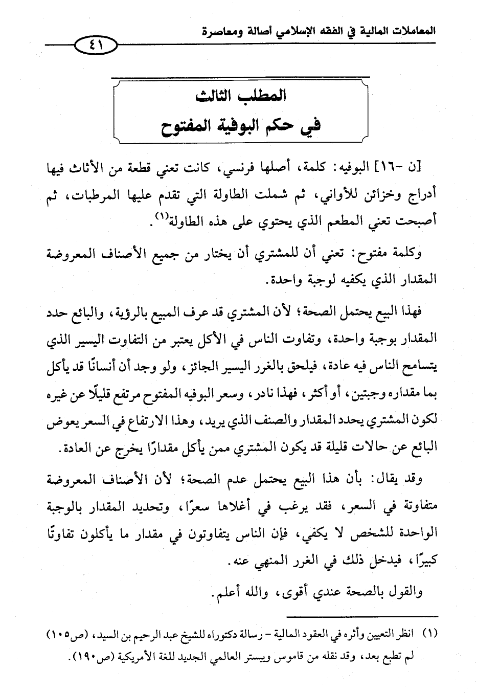 فهذا البيع يحتمل الصحة؛ لأن المشتري قد عرف المبيع بالرؤية، والبائع حدد المقدار بوجبة واحدة، وتفاوت الناس في الأكل يعتبر من التفاوت اليسير الذي يتسامح الناس فيه عادة، فيلحق بالغرر اليسير الجائز، ولو وجد أن أنسانًا قد يأكل بما مقداره وجبتين، أو أكثر، فهذا نادر، وسعر البوفيه المفتوح مرتفع قليلاً عن غيره لكون المشتري يحدد المقدار والصنف الذي يريد، وهذا الارتفاع في السعر يعوض البائع عن حالات قليلة قد يكون المشتري ممن يأكل مقدارًا يخرج عن العادة.