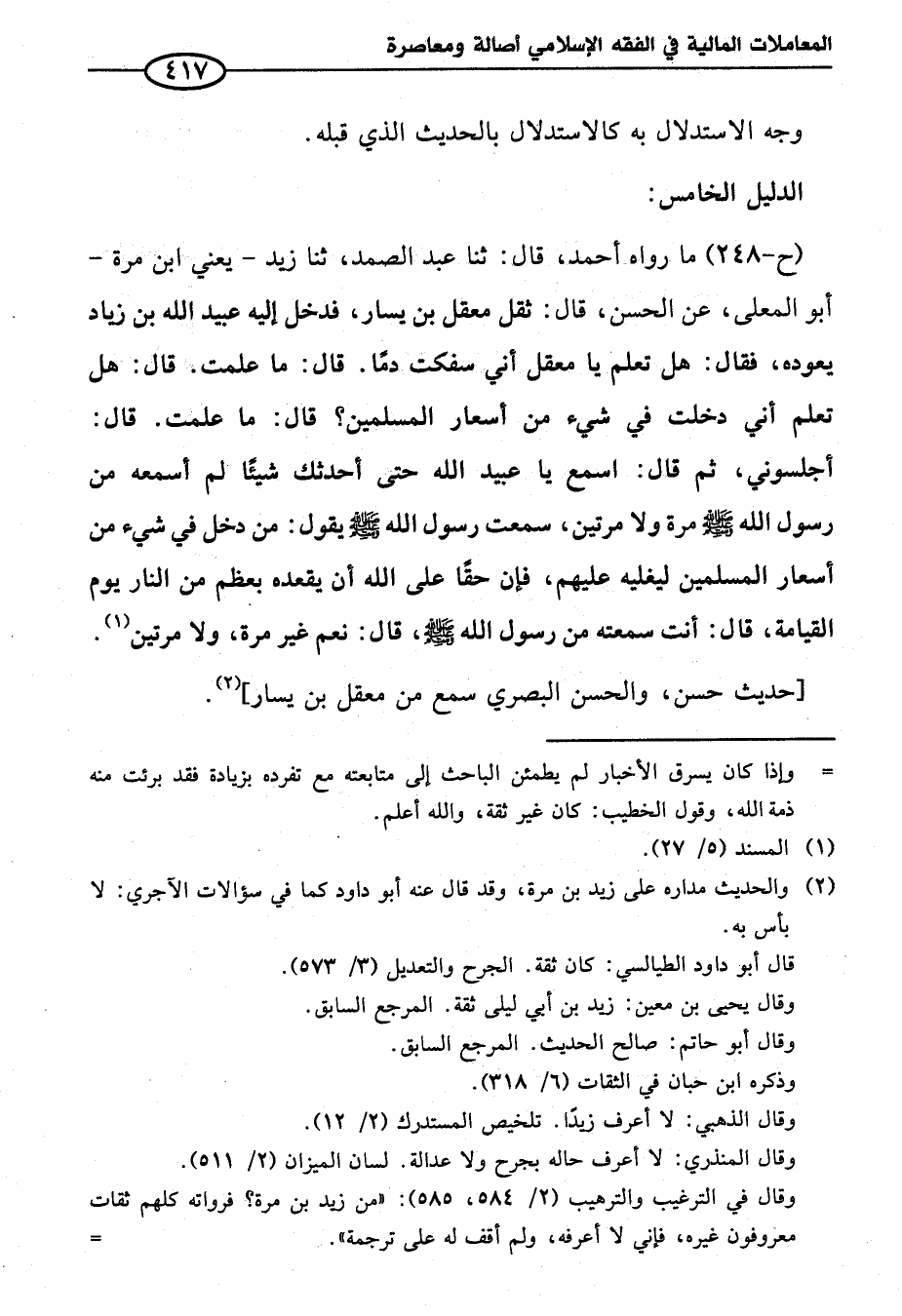 (ح-٢٤٨) ما رواه أحمد، قال: ثنا عبد الصمد، ثنا زيد -يعني ابن مرة- أبو المعلى، عن الحسن، قال: ثقل معقل بن يسار، فدخل إليه عبيد الله بن زياد يعوده، فقال: هل تعلم يا معقل أني سفكت دمًا. قال: ما علمت. قال: هل تعلم أني دخلت في شيء من أسعار المسلمين؟ قال. ما علمت. قال: أجلسوني، ثم قال: اسمع يا عبيد الله حتى أحدثك شيئًا لم أسمعه من رسول الله - صلى الله عليه وسلم - مرة ولا مرتين، سمعت رسول الله - صلى الله عليه وسلم - يقول: من دخل في شيء من أسعار المسلمين ليغليه عليهم، فإن حقًا على الله أن يقعده بعظم من النار يوم القيامة، قال: أنت سمعته من رسول الله - صلى الله عليه وسلم -، قال: نعم غير مرة، ولا مرتين (¬١).