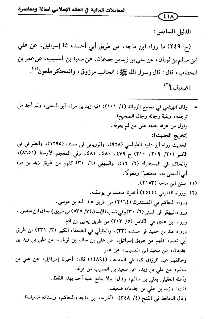 (ح-٢٤٩) ما رواه ابن ماجه، من طريق أبي أحمد، ثنا إسرائيل، عن علي ابن سالم بن ثوبان، عن علي بن زيد بن جدعان، عن سعيد بن المسيب، عن عمر بن الخطاب، قال: قال رسول الله - صلى الله عليه وسلم -: الجالب مرزوق، والمحتكر ملعون (¬١).