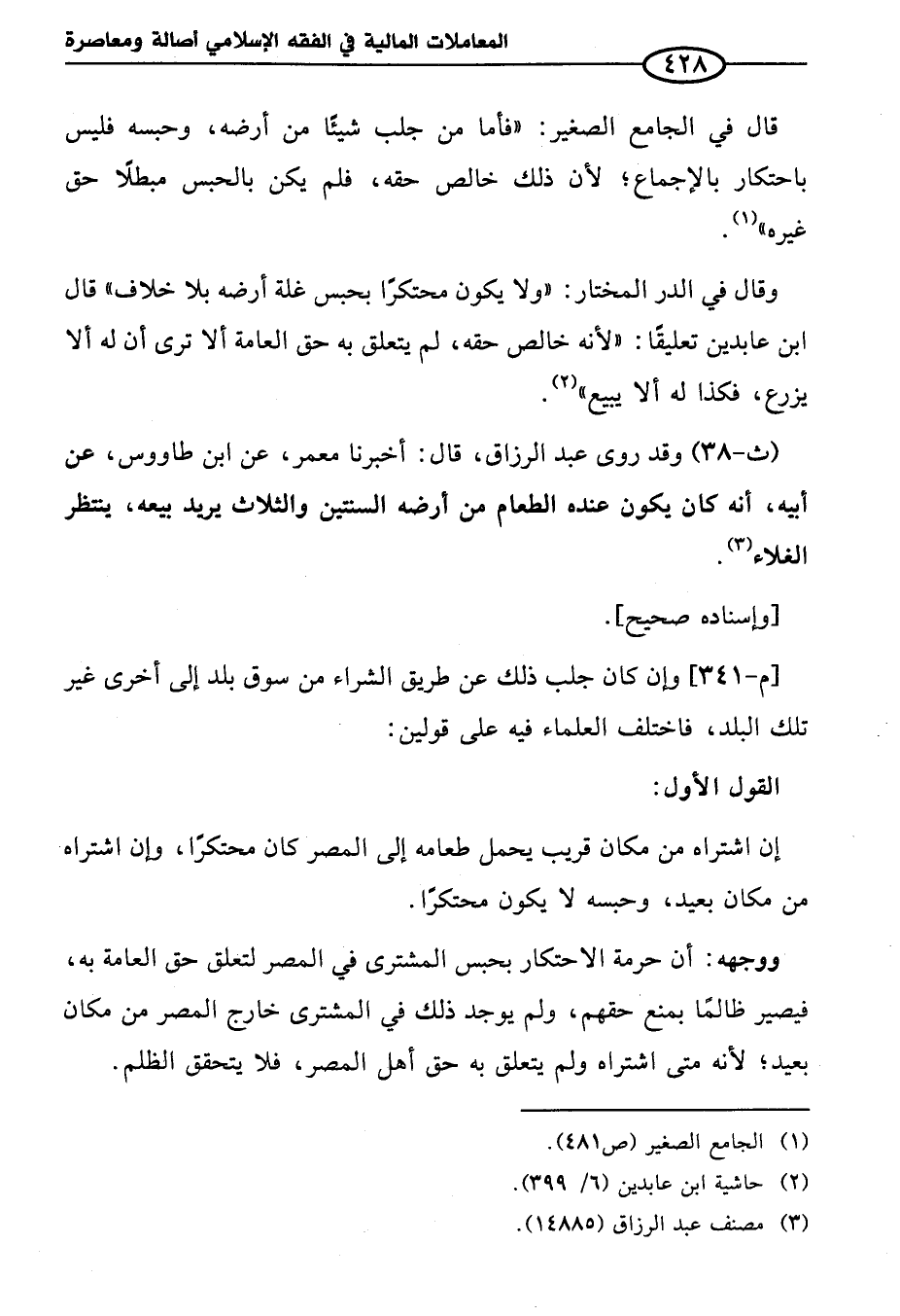 (ث-٣٨) وقد روى عبد الرزاق، قال: أخبرنا معمر، عن ابن طاووس، عن أبيه، أنه كان يكون عنده الطعام من أرضه السنتين والثلاث يريد بيعه، ينتظر الغلاء (¬٣).
