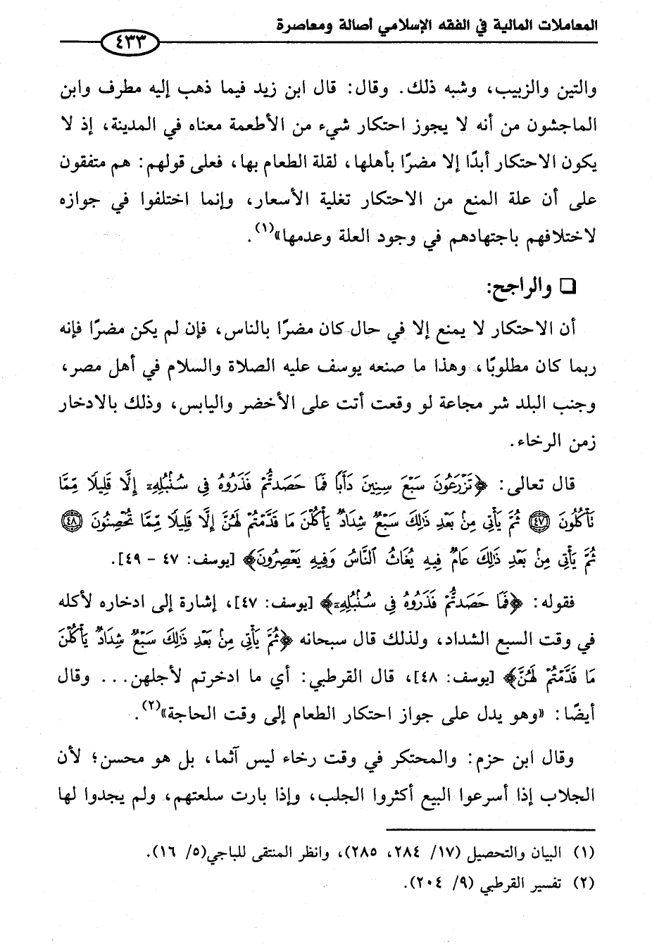 فقوله: {فَمَا حَصَدْتُمْ فَذَرُوهُ فِي سُنْبُلِهِ} [يوسف: ٤٧]، إشارة إلى ادخاره لأكله في وقت السبع الشداد، ولذلك قال سبحانه {ثُمَّ يَأْتِي مِنْ بَعْدِ ذَلِكَ سَبْعٌ شِدَادٌ يَأْكُلْنَ مَا قَدَّمْتُمْ لَهُنَّ} [يوسف: ٤٨]، قال القرطبي: أي ما ادخرتم لأجلهن ... وقال أيضًا: "وهو يدل على جواز احتكار الطعام إلى وقت الحاجة" (¬٢).