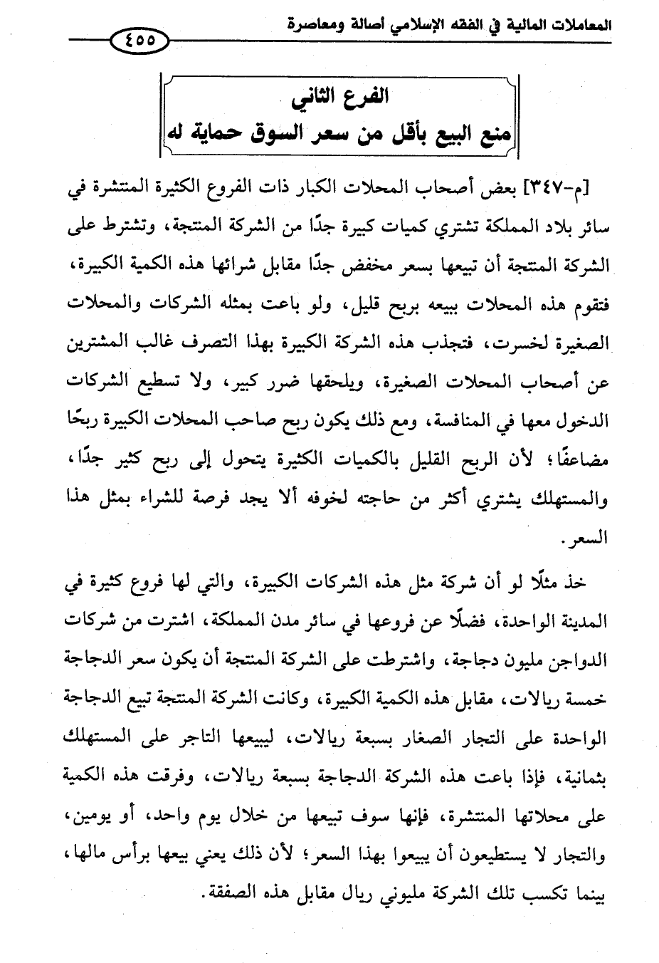 [م - ٣٤٧] بعض أصحاب المحلات الكبار ذات الفروع الكثيرة المنتشرة في سائر بلاد المملكة تشتري كميات كبيرة جدًا من الشركة المنتجة، وتشترط على الشركة المنتجة أن تبيعها بسعر مخفض جدًا مقابل شرائها هذه الكمية الكبيرة، فتقوم هذه المحلات ببيعه بربح قليل، ولو باعت بمثله الشركات والمحلات الصغيرة لخسرت، فتجذب هذه الشركة الكبيرة بهذا التصرف غالب المشترين عن أصحاب المحلات الصغيرة، ويلحقها ضرر كبير، ولا تسطيع الشركات الدخول معها في المنافسة، ومع ذلك يكون ربح صاحب المحلات الكبيرة ربحًا مضاعفًا؛ لأن الربح القليل بالكميات الكثيرة يتحول إلى ربح كثير جدًا، والمستهلك يشتري أكثر من حاجته لخوفه ألا يجد فرصة للشراء بمثل هذا السعر.