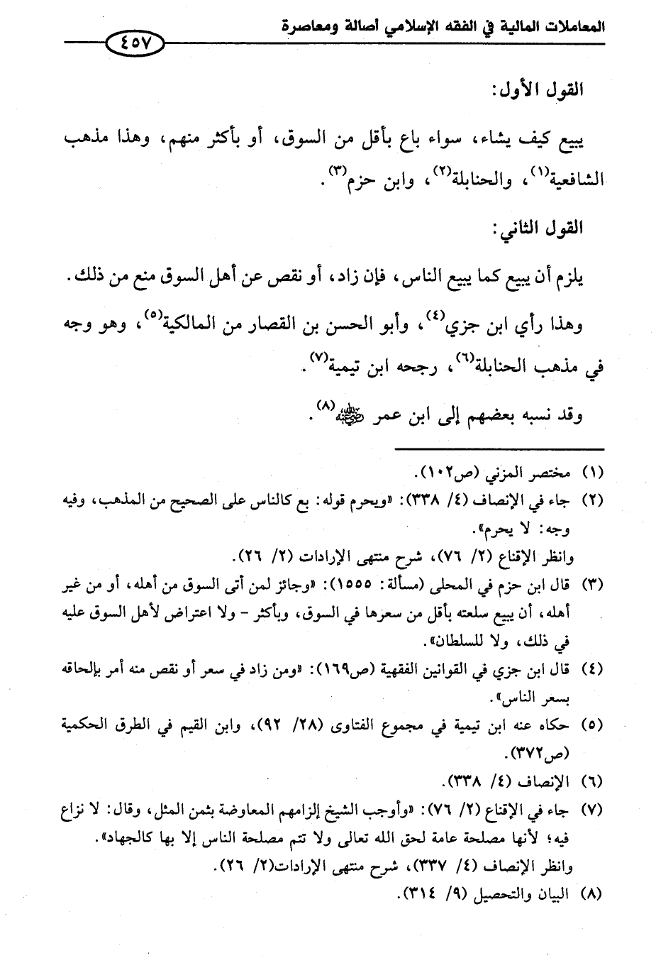 (¬٣) قال ابن حزم في المحلى (مسألة: ١٥٥٥): "وجائز لمن أتى السوق من أهله، أو من غير أهله، أن يبيع سلعته بأقل من سعرها في السوق، وبأكثر ولا اعتراض لأهل السوق عليه في ذلك، ولا للسلطان".