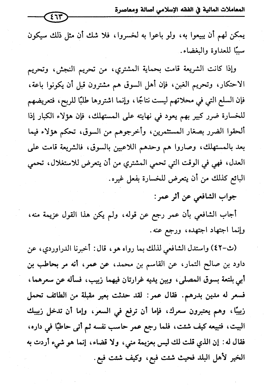 (ث-٤٢) واستدل الشافعي لذلك بما رواه هو، قال: أخبرنا الدراوردي، عن داود بن صالح التمار، عن القاسم بن محمَّد، عن عمر، أنه مر بحاطب بن أبي بلتعة بسوق المصلى، وبين يديه غرارتان فيهما زبيب، فسأله عن سعرهما، فسعر له مدين بدرهم. فقال عمر: لقد حدثت بعير مقبلة من الطائف تحمل زبيبًا، وهم يعتبرون سعرك، فإما أن ترفع في السعر، وإما أن تدخل زبيبك البيت، فتبيعه كيف شئت، فلما رجع عمر حاسب نفسه ثم أتى حاطبًا في داره، فقال له: إن الذي قلت لك ليس بعزيمة مني، ولا قضاء، إنما هو شيء أردت به الخير لأهل البلد فحيث شئت فبع، وكيف شئت فبع.