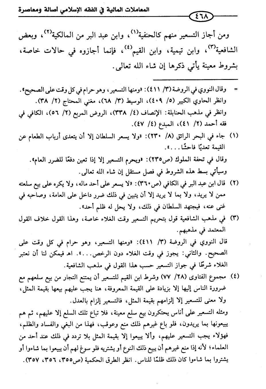 (¬٤) مجموع الفتاوى (٢٨/ ٧٧) وشرط ابن القيم للتسعير أن يمتنع التجار من بيع سلعهم مع ضرورة الناس إليها إلا بزيادة على القيمة المعروفة، هنا يجب عليهم بيعها بقيمة المثل، ولا معنى للتسعير إلا إلزامهم بقيمة المثل، فالتسعير إلزام بالعدل.