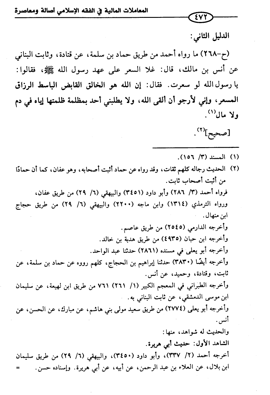 (ح-٢٦٨) ما رواه أحمد من طريق حماد بن سلمة، عن قتادة، وثابت البناني عن أنس بن مالك، قال: غلا السعر على عهد رسول الله - صلى الله عليه وسلم -، فقالوا: يا رسول الله لو سعرت. فقال: إن الله هو الخالق القابض الباسط الرزاق المسعر، وإني لأرجو أن ألقى الله، ولا يطلبني أحد بمظلمة ظلمتها إياه في دم ولا مال (¬١).