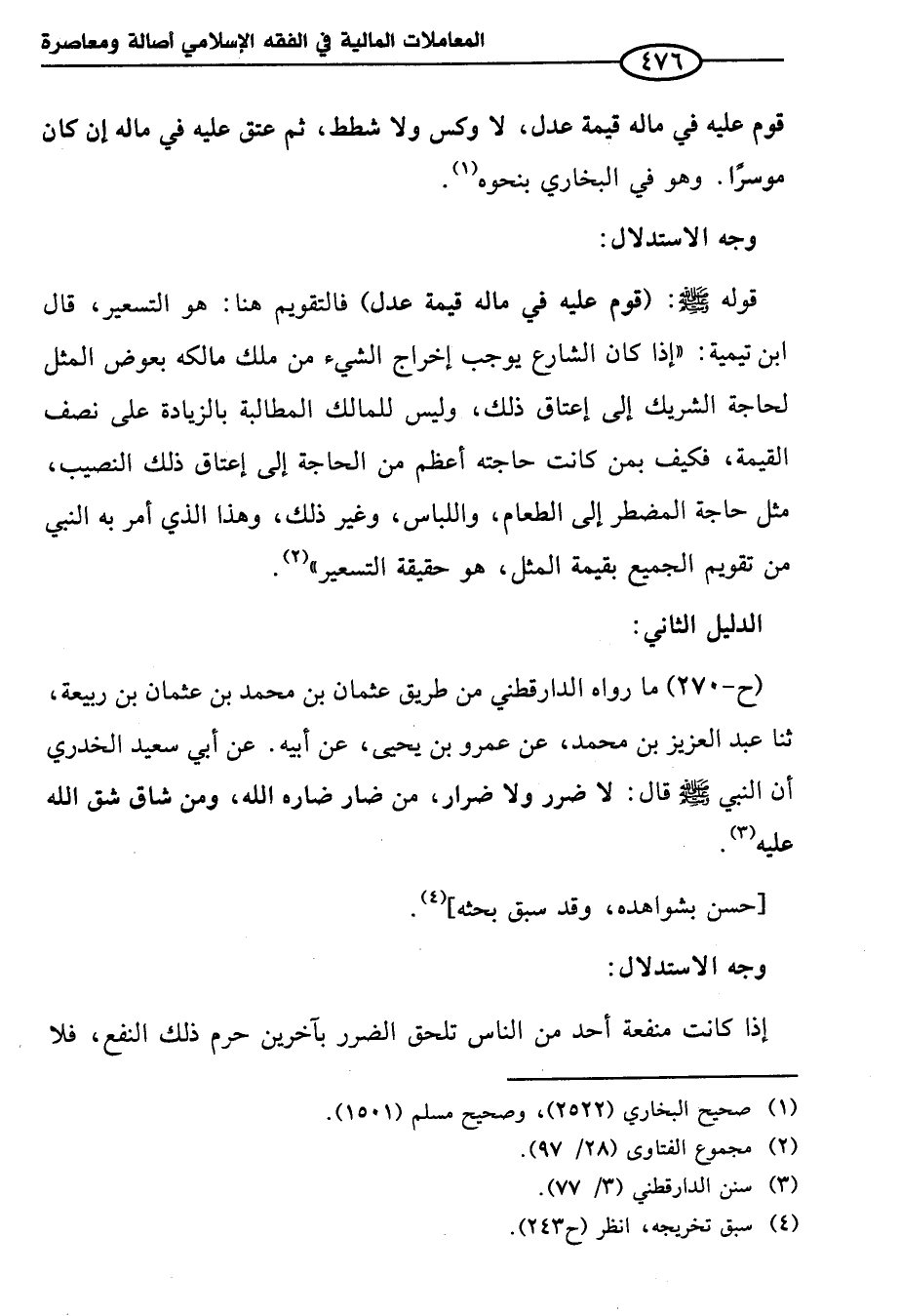 قوله - صلى الله عليه وسلم -: (قوم عليه في ماله قيمة عدل) فالتقويم هنا: هو التسعير، قال ابن تيمية: "إذا كان الشارع يوجب إخراج الشيء من ملك مالكه بعوض المثل لحاجة الشريك إلى إعتاق ذلك، وليس للمالك المطالبة بالزيادة على نصف القيمة، فكيف بمن كانت حاجته أعظم من الحاجة إلى إعتاق ذلك النصيب، مثل حاجة المضطر إلى الطعام، واللباس، وغير ذلك، وهذا الذي أمر به النبي من تقويم الجميع بقيمة المثل، هو حقيقة التسعير" (¬٢).