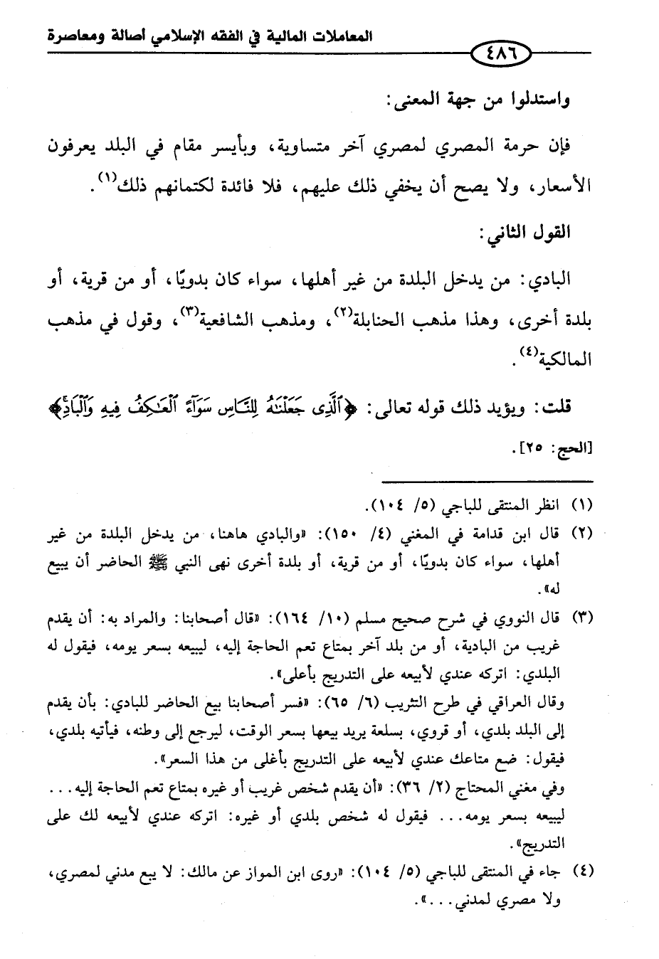 (¬٢) قال ابن قدامة في المغني (٤/ ١٥٠): "والبادي ها هنا، من يدخل البلدة من غير أهلها، سواء كان بدويًا، أو من قرية، أو بلدة أخرى نهى النبي - صلى الله عليه وسلم - الحاضر أن يبيع له".