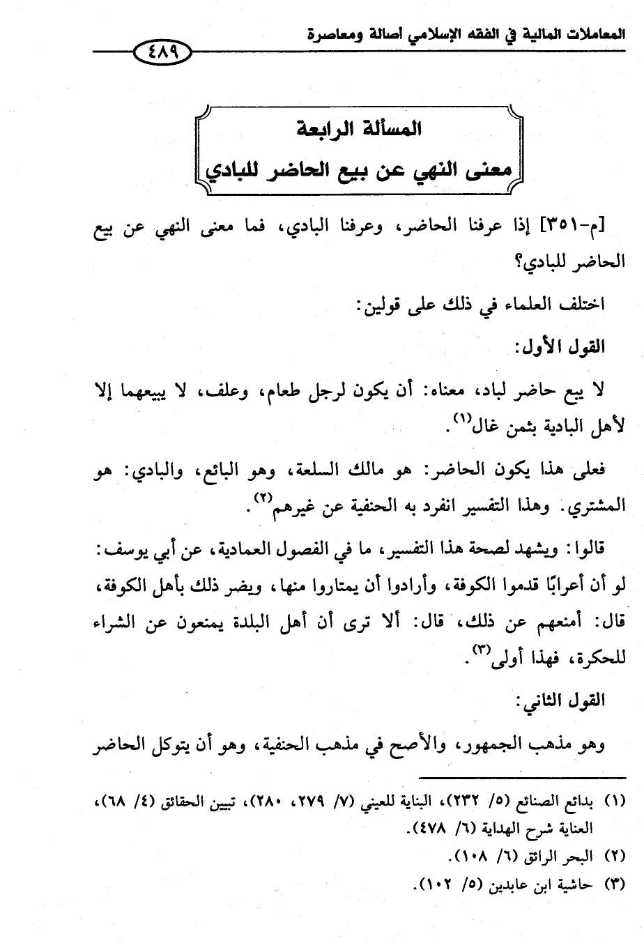 المسألة الرابعة معنى النهي عن بيع الحاضر للبادي