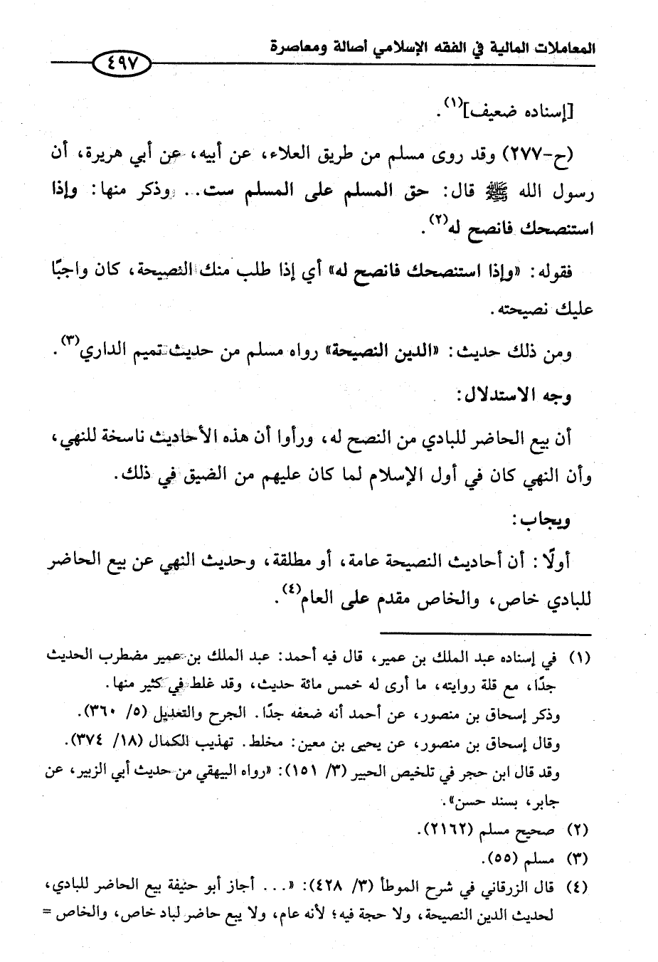 أولاً: أن أحاديث النصيحة عامة، أو مطلقة، وحديث النهي عن بيع الحاضر للبادي خاص، والخاص مقدم على العام (¬٤).