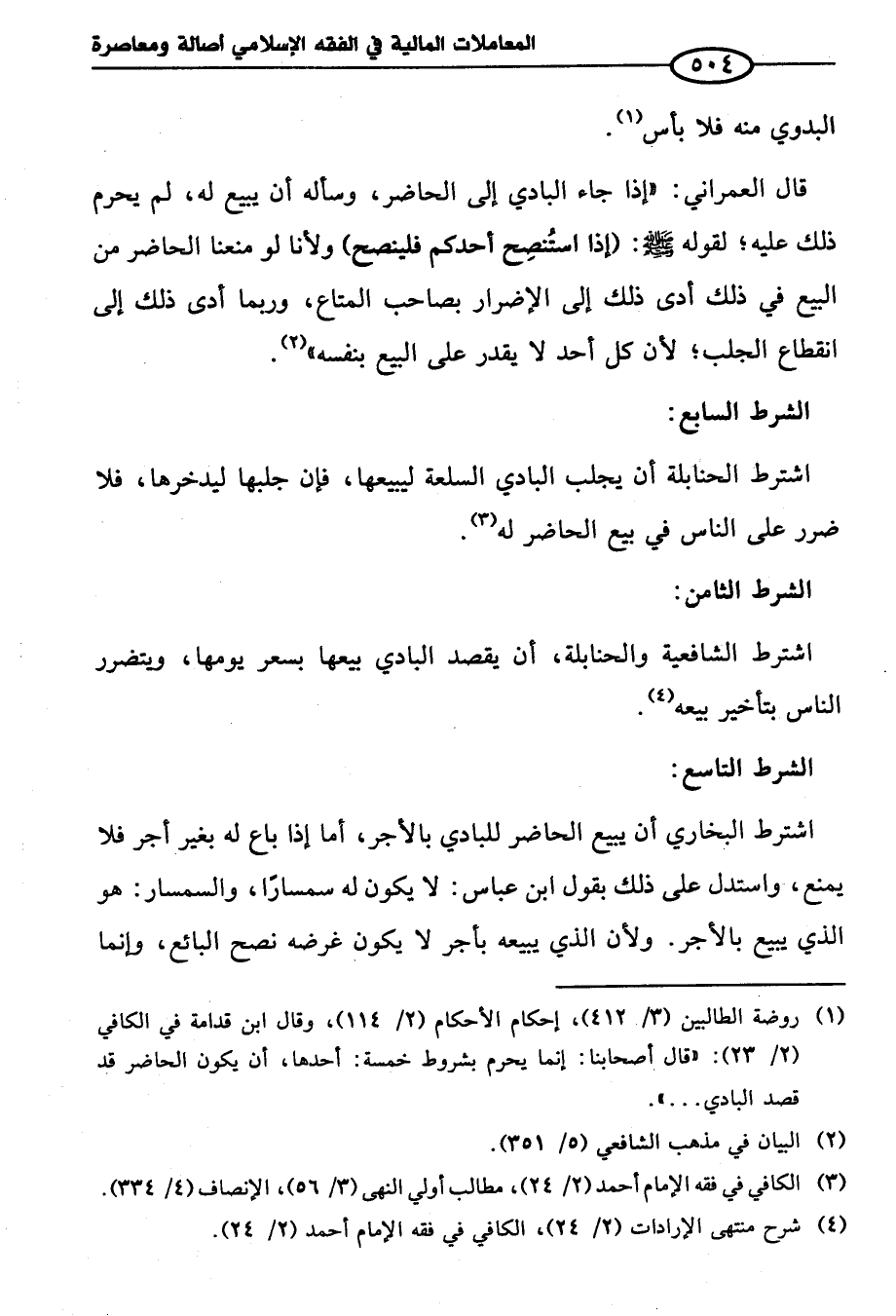(¬١) روضة الطالبين (٣/ ٤١٢)، إحكام الأحكام (٢/ ١١٤)، وقال ابن قدامة في الكافي (٢/ ٢٣): "قال أصحابنا: إنما يحرم بشروط خمسة: أحدها، أن يكون الحاضر قد قصد البادي ... "