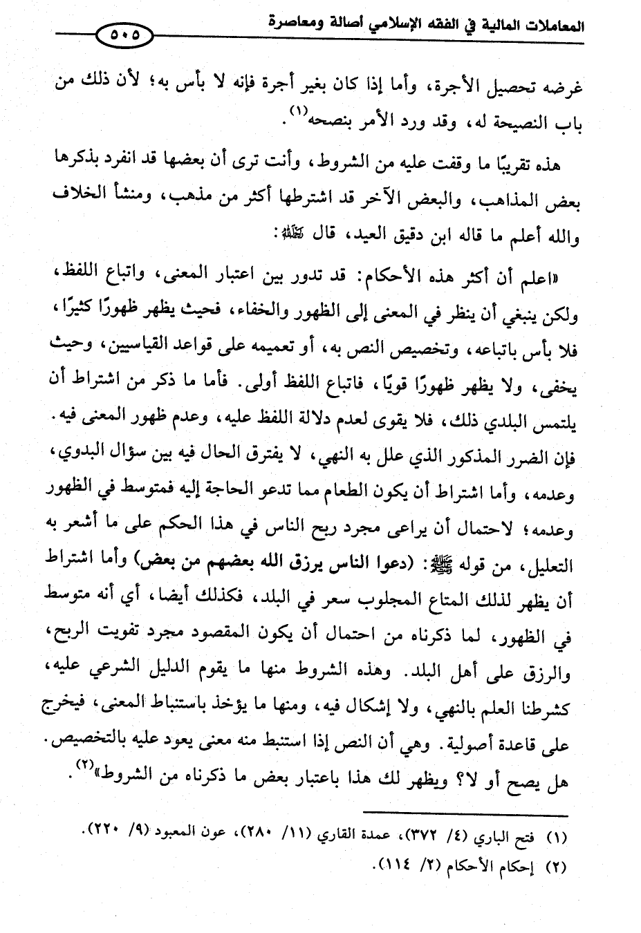 "أعلم أن أكثر هذه الأحكام: قد تدور بين اعتبار المعنى، واتباع اللفظ، ولكن ينبغي أن ينظر في المعنى إلى الظهور والخفاء، فحيث يظهر ظهورًا كثيرًا، فلا بأس باتباعه، وتخصيص النص به، أو تعميمه على قواعد القياسيين، وحيث يخفى، ولا يظهر ظهورًا قويًا، فاتباع اللفظ أولى. فأما ما ذكر من اشتراط أن يلتمس البلدي ذلك، فلا يقوى لعدم دلالة اللفظ عليه، وعدم ظهور المعنى فيه. فإن الضرر المذكور الذي علل به النهي، لا يفترق الحال فيه بين سؤال البدوي، وعدمه، وأما اشتراط أن يكون الطعام مما تدعو الحاجة إليه فمتوسط في الظهور وعدمه؛ لاحتمال أن يراعى مجرد ريح الناس في هذا الحكم على ما أشعر به التعليل، من قوله - صلى الله عليه وسلم -: (دعوا الناس يرزق الله بعضهم من بعض) وأما اشتراط أن يظهر لذلك المتاع المجلوب سعر في البلد، فكذلك أيضاً، أي أنه متوسط في الظهور، لما ذكرناه من احتمال أن يكون المقصود مجرد تفويت الربح، والرزق على أهل البلد. وهذه الشروط منها ما يقوم الدليل الشرعي عليه، كشرطنا العلم بالنهي، ولا إشكال فيه، ومنها ما يؤخذ باستنباط المعنى، فيخرج على قاعدة أصولية. وهي أن النص إذا استنبط منه معنى يعود عليه بالتخصيص. هل يصح أو لا؟ ويظهر لك هذا باعتبار بعض ما ذكرناه من الشروط" (¬٢).