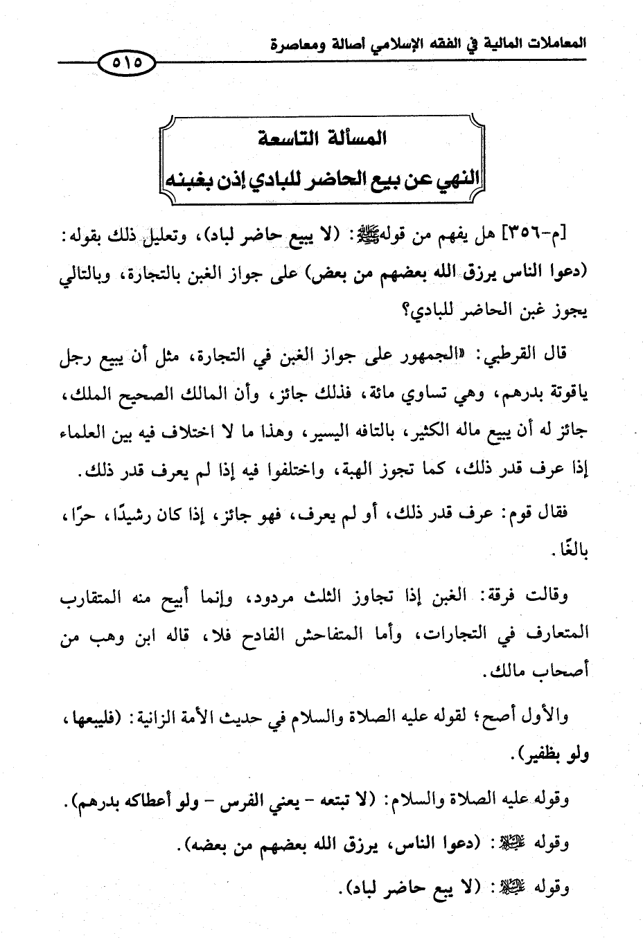 المسألة التاسعة النهي عن بيع الحاضر للبادي إذن بغبنه