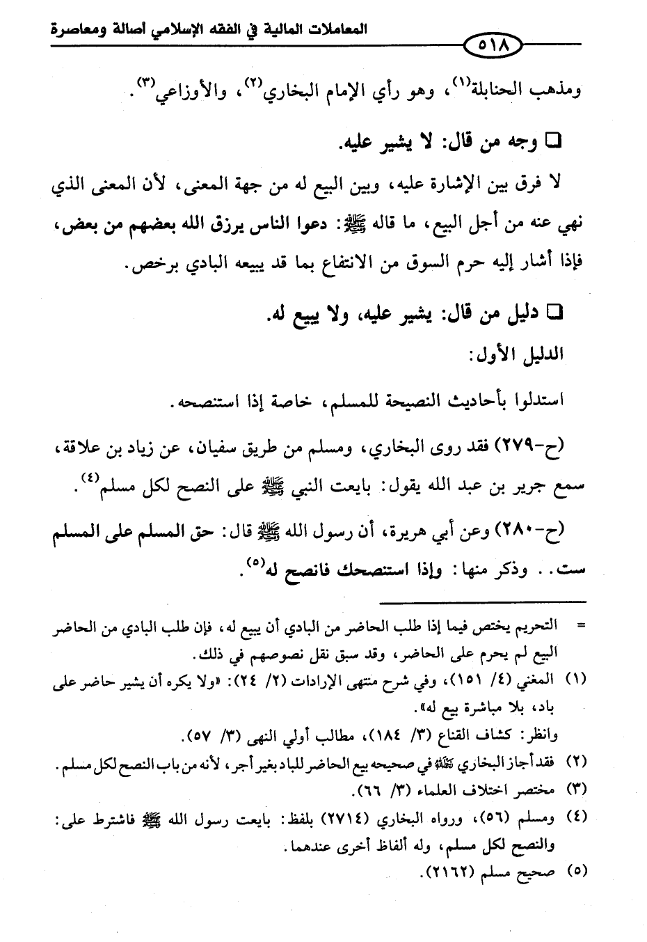 (¬٢) فقد أجاز البخاري رحمه الله في صحيحه بيع الحاضر للباد بغير أجر؛ لأنه من باب النصح لكل مسلم.