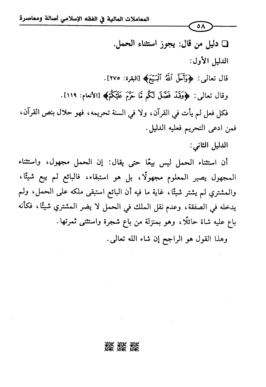 أن استثناء الحمل ليس بيعًا حتى يقال: إن الحمل مجهول، واستثناء المجهول يصير المعلوم مجهولًا، بل هو استبقاء، فالبائع لم يبع شيئًا، والمشتري لم يشتر شيئًا، غاية ما فيه أن البائع استبقى ملكه على الحمل، ولم يدخله في الصفقة، وعدم نقل الملك في الحمل لا يضر المشتري شيئًا، فكانه باع عليه شاة حائلًا، وهو بمنزلة من باع شجرة واستثنى ثمرتها.