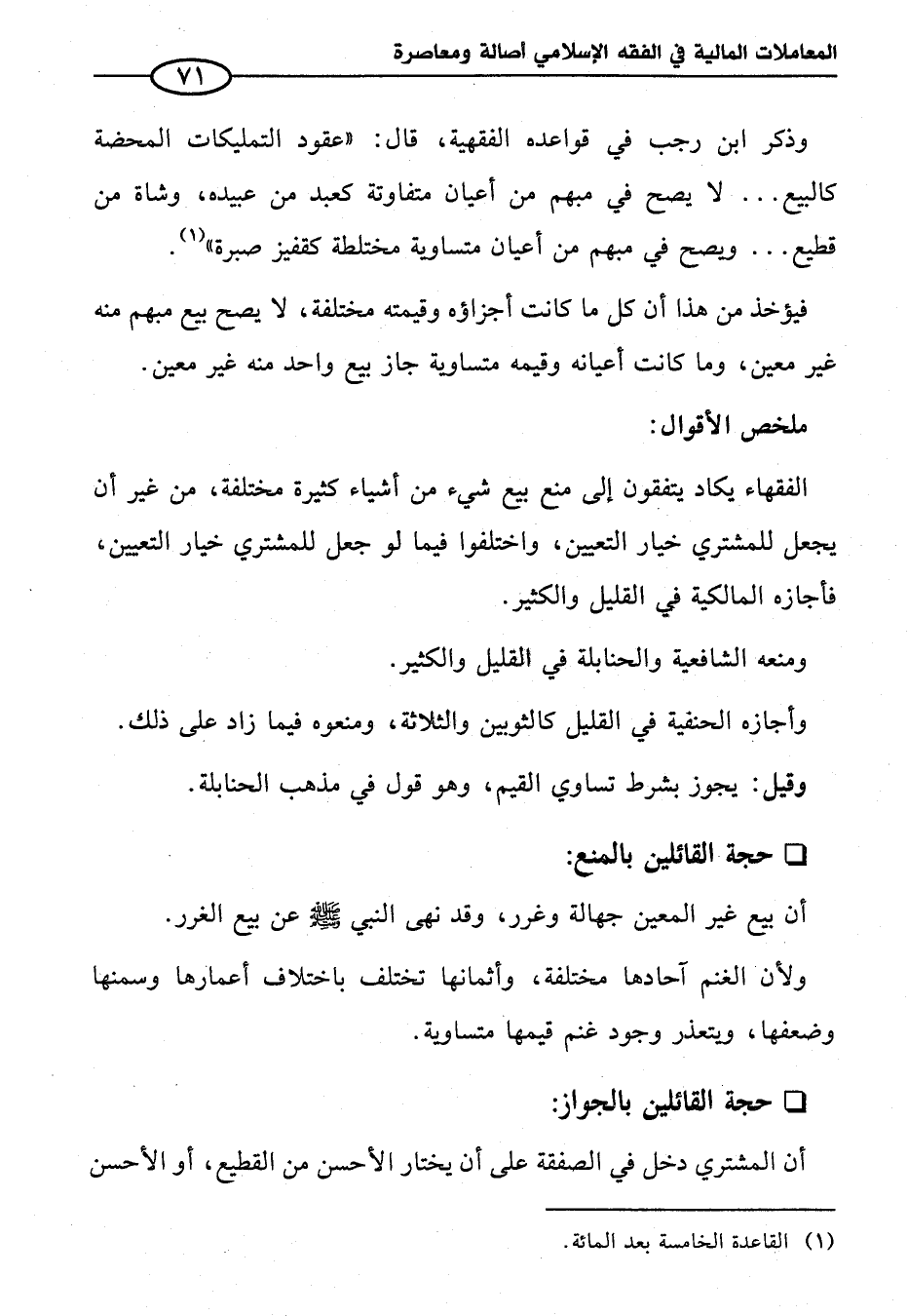 وذكر ابن رجب في قواعده الفقهية، قال: "عقود التمليكات المحضة كالبيع ... لا يصح في مبهم من أعيان متفاوتة كعبد من عبيده، وشاة من قطيع ... ويصح في مبهم من أعيان متساوية مختلطة كقفيز صبرة (¬١).