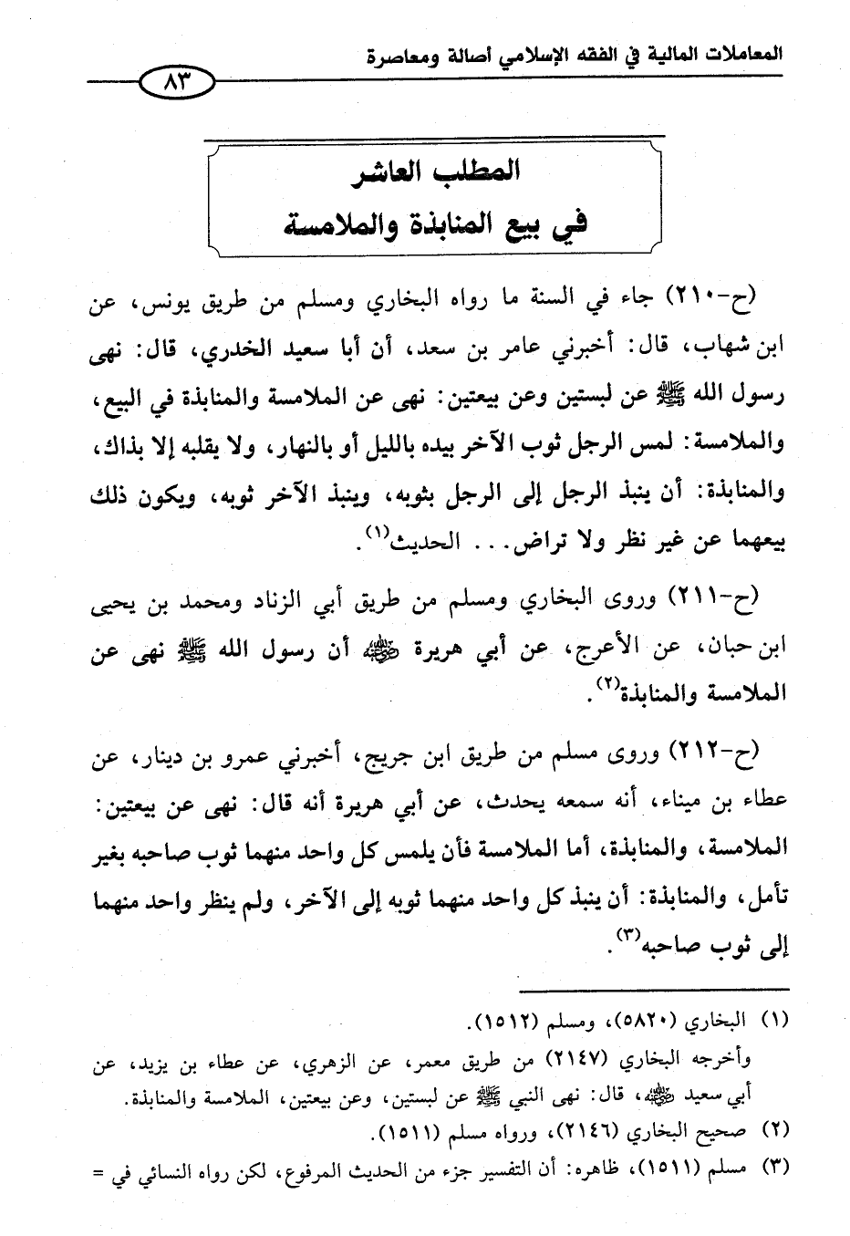 (ح - ٢١١) وروى البخاري ومسلم من طريق أبي الزناد ومحمد بن يحيى ابن حبان، عن الأعرج، عن أبي هريرة - رضي الله عنه - أن رسول الله - صلى الله عليه وسلم - نهى عن الملامسة والمنابذة (¬٢).