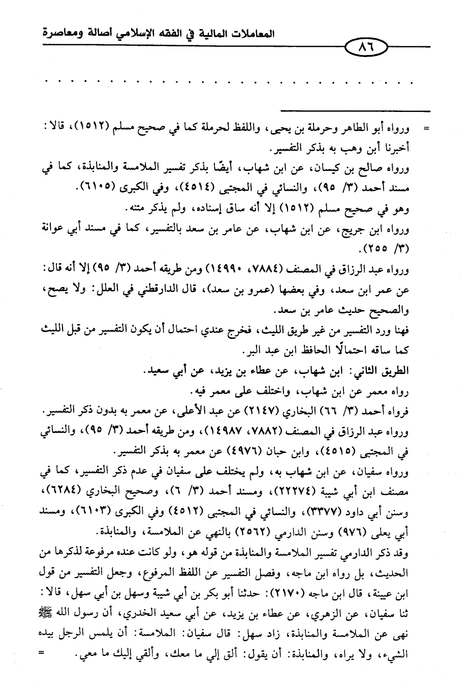 وقد ذكر الدارمي تفسير الملامسة والمنابذة من قوله هو، ولو كانت عنده مرفوعة لذكرها من الحديث، بل رواه ابن ماجه، وفصل التفسير عن اللفظ المرفوع، وجعل التفسير من قول ابن عيينة، قال ابن ماجه (٢١٧٠): حدثنا أبو بكر بن أبي شيبة وسهل بن أبي سهل، قالا: ثنا سفيان، عن الزهري، عن عطاء بن يزيد، عن أبي سعيد الخدري، أن رسول الله - صلى الله عليه وسلم - نهى عن الملامسة والمنابذة، زاد سهل: قال سفيان: الملامسة: أن يلمس الرجل بيده الشيء، ولا يراه، والمنابذة: أن يقول: ألق إلي ما معك، وألقي إليك ما معي. =