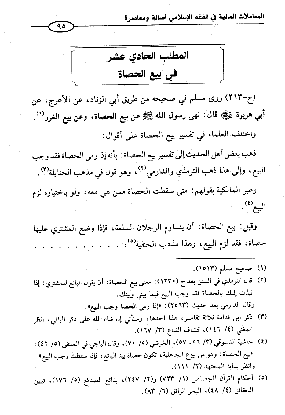 (¬٤) حاشية الدسوقي (٣/ ٥٦، ٥٧)، الخرشي (٥/ ٧٠)، وقال الباجي في المنتقى (٥/ ٤٢): "بيع الحصاة: وهو من بيوع الجاهلية، تكون حصاة بيد البائع، فإذا سقطت وجب البيع". وانظر بداية المجتهد (٢/ ١١١).