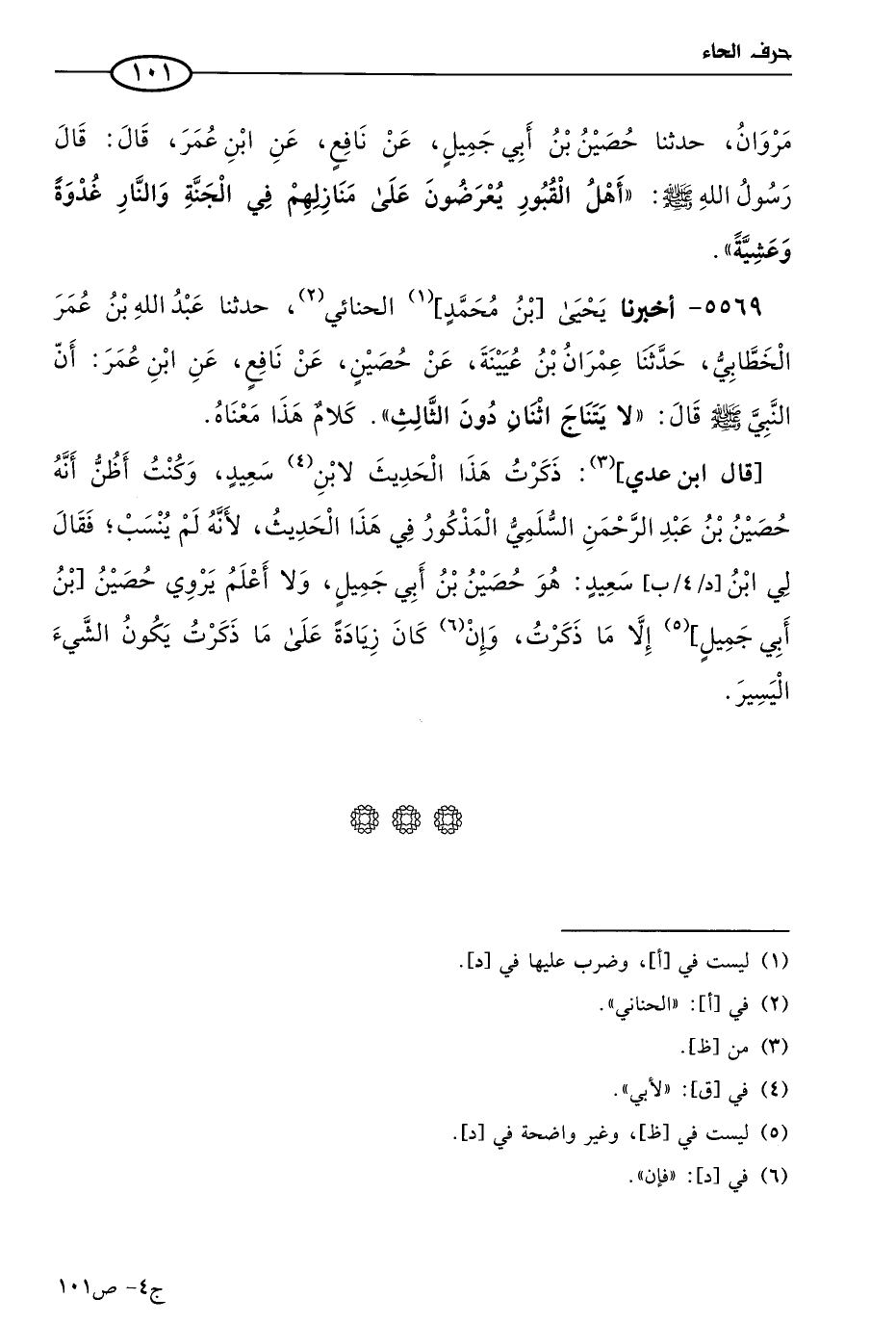 5569 - أخبرنا يَحيى بن مُحمد الحنائي، حَدثنا عَبد الله بن عُمر الخطابي، حَدثنا عمران بن عُيَينة، عن حصين، عن نافع، عن ابن عُمر، أن النبي صَلى الله عَليه وسَلم قال: لا يتناجى اثنان دون الثالث. كلام هذا معناه.