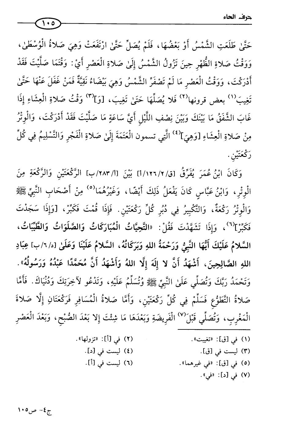 وكان ابن عُمر يفرق بين الركعتين والركعة من الوتر، وابن عباس كان يفعل ذلك أَيضًا، وغيرهما من أصحاب النبي صَلى الله عَليه وسلم، والوتر ركعة، والتكبير في دبر كل ركعتين، فإذا قمت فكبر، وإذا سجدت فكبر، وإذا تشهدت فقل: التحيات المباركات والصلوات والطيبات السلام عليك أيها النبي ورحمة الله وبركاته، السلام علينا وعلى عباد الله الصالحين، أشهد أن لا إله إلا الله وأشهد أن محمدا عبده ورسوله، وتحمد ربك وتصلي على النبي صَلى الله عَليه وسلم وتسلم عليه، وتدعو لآخرتك ودنياك، فأما صلاة التطوع فسلم في كل ركعتين، وأما صلاة المسافر فركعتان إلا صلاة المغرب، وتصلي قبل الفريضة وبعدها ما شئت إلا بعد الصبح وبعد العصر ليس بعدهما صلاة في سفر، ولا حضر.