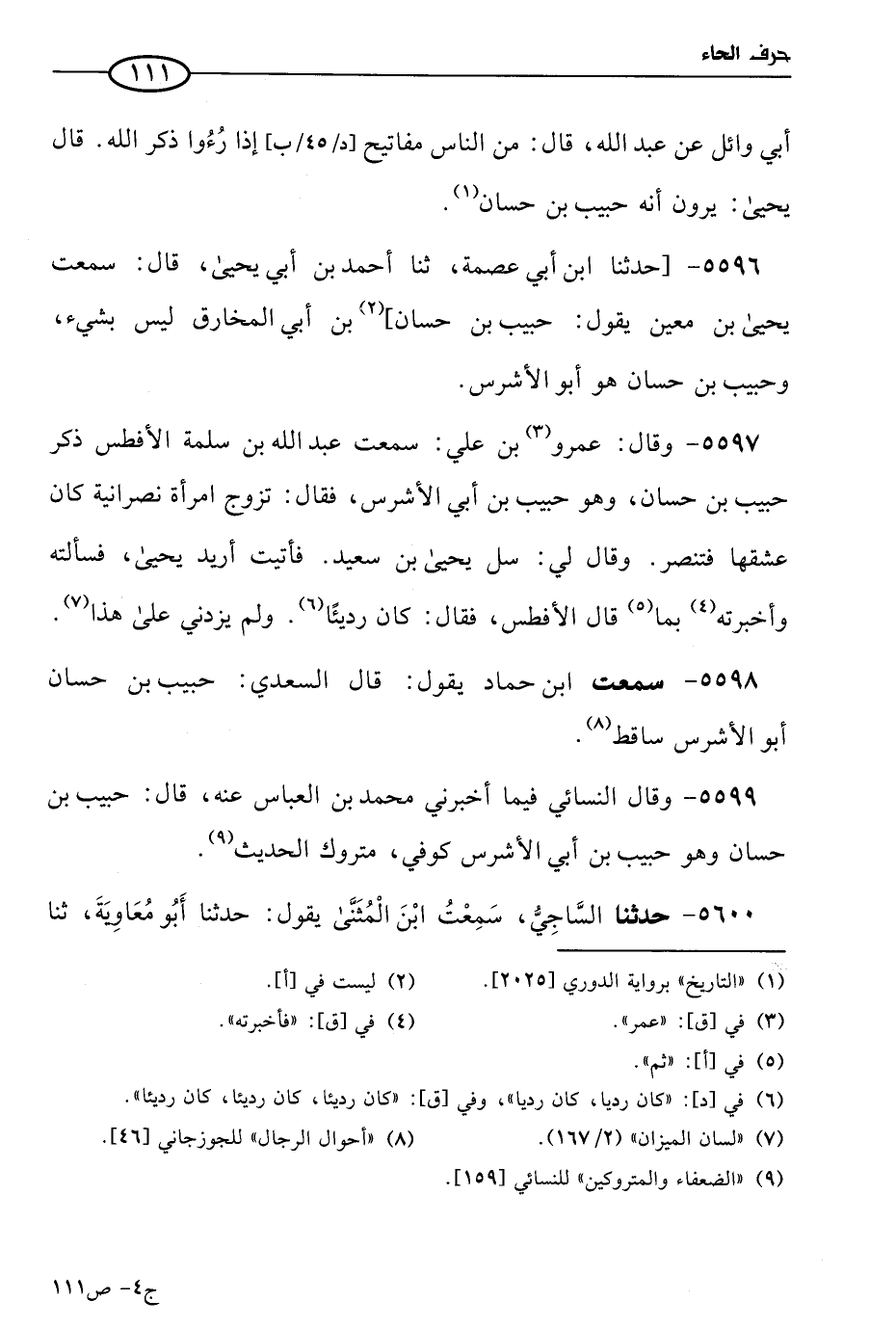 5597 - وقال عَمرو بن علي: سمعت عَبد الله بن سلمة الأفطس ذكر حبيب بن حسان، وهو حبيب بن أبي الأشرس، فقال: تزوج امرأة نصرانية كان عشقها فتنصر، وقال لي: سل يَحيى بن سعيد، فأتيت أريد يَحيى، فسألته وأخبرته بما قال الأفطس، فقال: كان رديئا ولم يزدني على هذا.