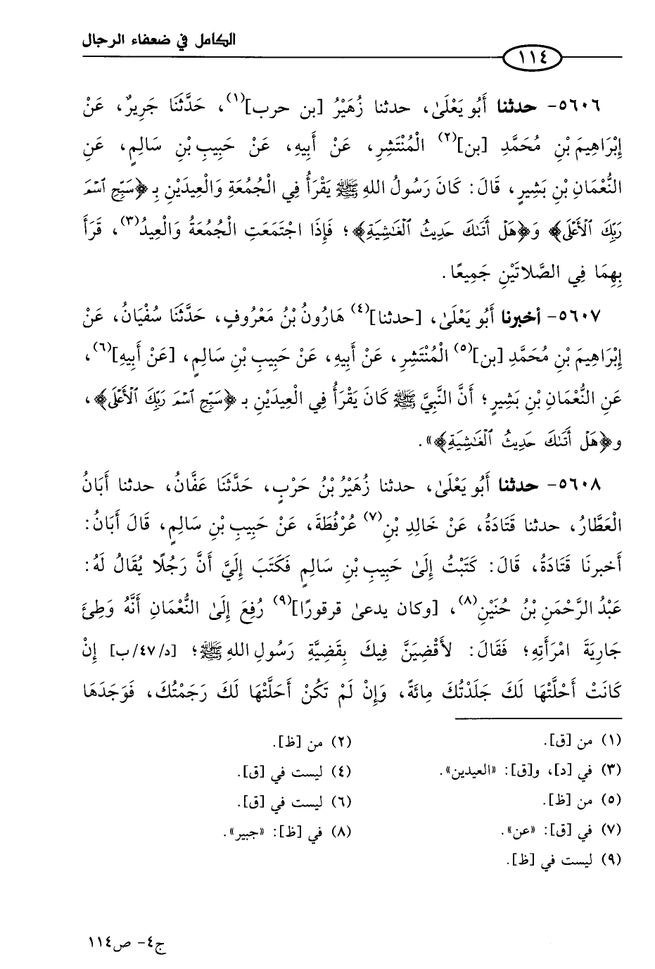 5607 - أخبرنا أَبو يَعلَى، حَدثنا هارون بن معروف، حَدثنا سُفيان، عن إبراهيم بن مُحمد بن المنتشر، عن أبيه، عن حبيب بن سالم، عن أبيه، عن النعمان بن بشير؛ أن النبي صَلى الله عَليه وسلم كان يقرأ في العيدين بـ: {سَبِّح اسم رَبِّك الأَعلَى}، و: {هل أتاك حديث الغاشية}.