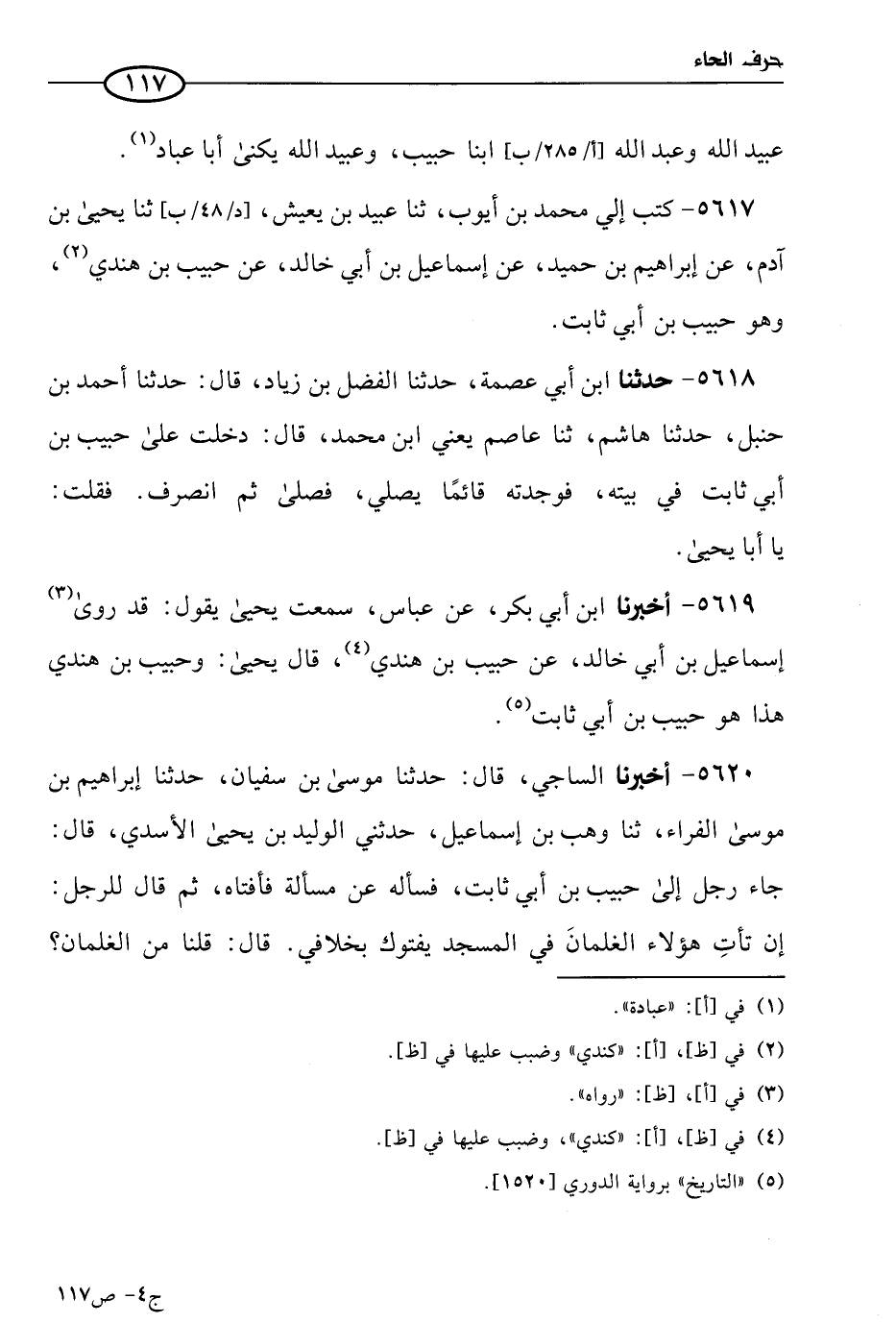 5617 - كتب إلي مُحمد بن أيوب، حَدثنا عُبيد بن يعيش، حَدثنا يَحيى بن آدم، عن إبراهيم بن حميد عن إسماعيل بن أبي خالد، عن حبيب بن كندي، وهو حبيب بن أبي ثابت.