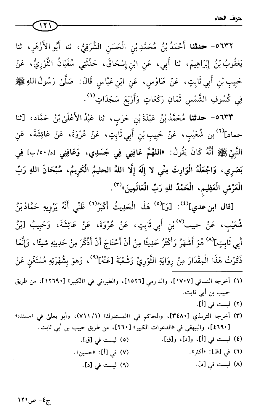 5632 - حَدثنا أحمد بن مُحمد بن الحسن الشرقي، حَدثنا أَبو الأزهر، حَدثنا يعقوب بن إبراهيم، حَدثنا أبي، عن ابن إسحاق، حَدَّثني سفيان الثَّوري، عن حبيب بن أبي ثابت، عن طاووس، عن ابن عباس قال: صلى رسول الله صَلى الله عَليه وسَلم في كسوف الشمس ثمان ركعات وأربع سجدات.