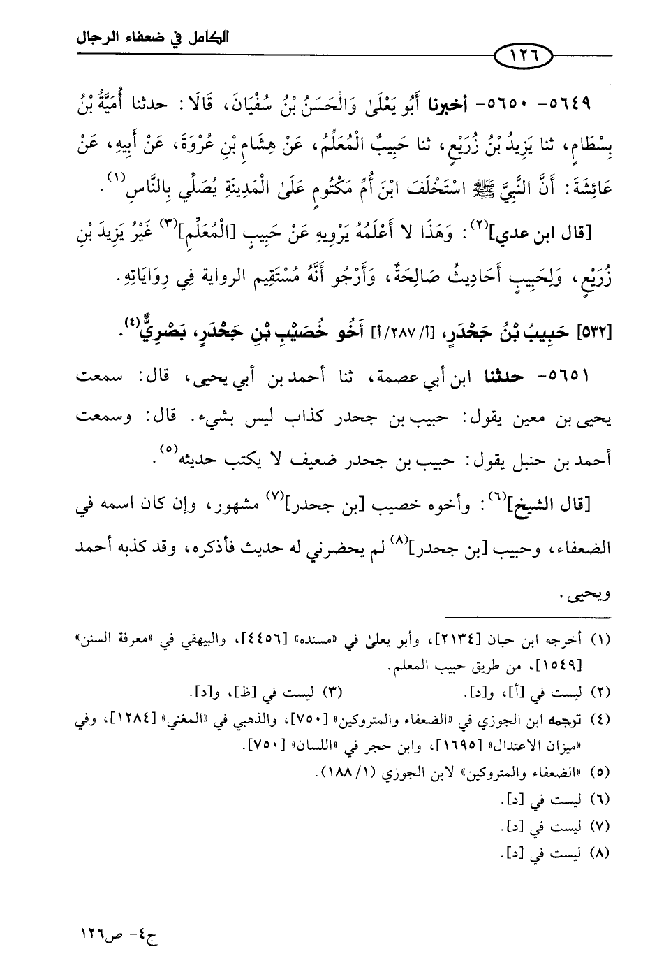 5651 - حَدثنا ابن أبي عصمة، حَدثنا أحمد بن أبي يَحيى، قال: سمعتُ يَحيى بن مَعين يقول: حبيب بن جحدر كذاب ليس بشَيءٍ. قال: وسمعتُ أحمد بن حنبل يقول: حبيب بن جحدر ضعيف لا يُكتَب حديثُهُ.